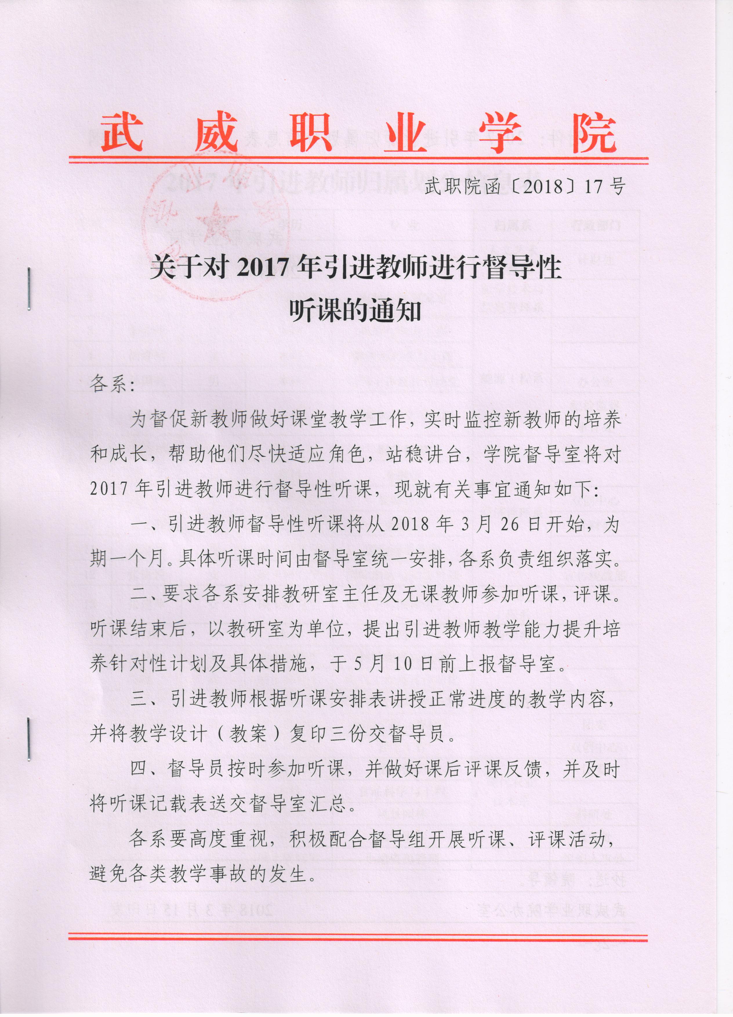 關(guān)于對2017年引進(jìn)教師進(jìn)行督導(dǎo)性聽課的通知