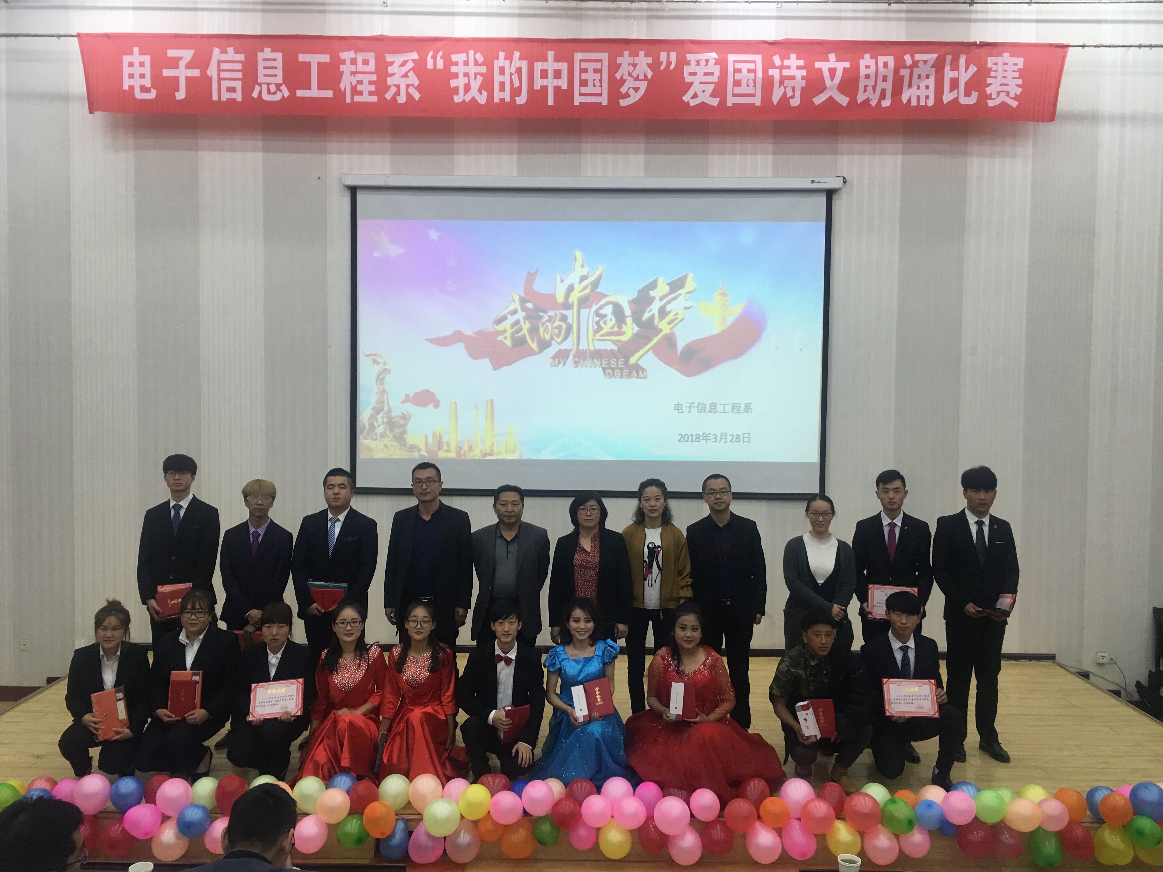 ? ? 為進(jìn)一步弘揚(yáng)培育社會(huì)主義核心價(jià)值觀引導(dǎo)學(xué)生實(shí)現(xiàn)國(guó)家富強(qiáng)、民族復(fù)興的偉大“中國(guó)夢(mèng)”而發(fā)憤圖強(qiáng)、勇?lián)厝危?/span>激勵(lì)學(xué)生通過(guò)誦讀經(jīng)典來(lái)繼承傳統(tǒng),增強(qiáng)學(xué)生的愛(ài)國(guó)情感。328日,電子信息工程系在正德廳舉辦了“我的中國(guó)夢(mèng)”愛(ài)國(guó)詩(shī)文朗誦比賽。電子信息工程系黨總支書記袁青年、系主任李亞梅、全體班主任學(xué)生觀看比賽。