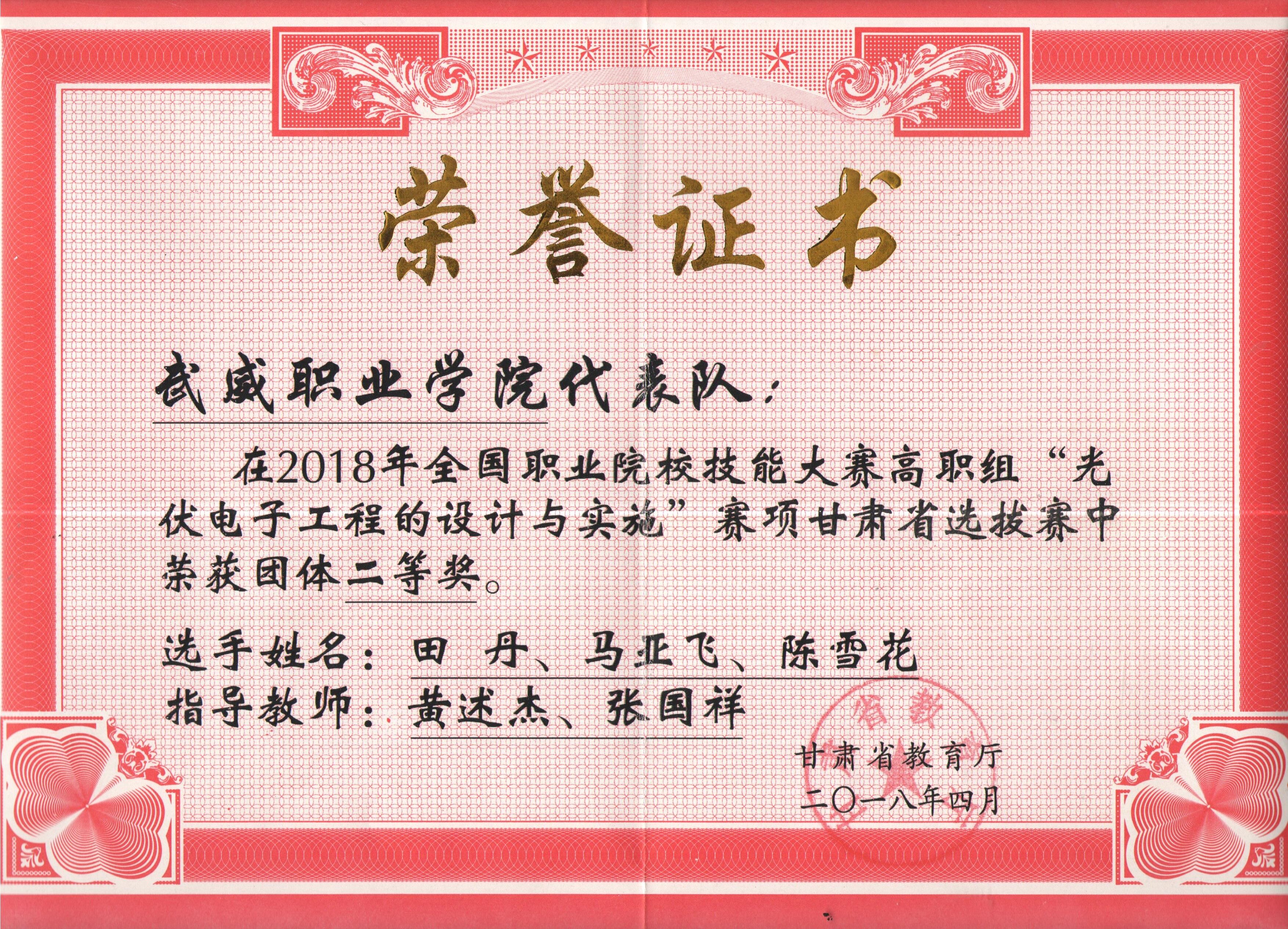 414日,2018年全國職業(yè)院校技能大賽“光伏電子工程的設(shè)計與實施”賽項甘肅省選拔賽在甘肅林業(yè)職業(yè)技術(shù)學(xué)院舉行。此次大賽有蘭州石化職業(yè)技術(shù)學(xué)院、甘肅林業(yè)職業(yè)技術(shù)學(xué)院、武威職業(yè)學(xué)院等6所院校的11支代表隊33名選手參加。由我院能源工程系黃述杰、張國祥老師指導(dǎo),田丹、馬亞飛、陳雪花三名學(xué)生組成的武威職業(yè)學(xué)院一隊榮獲二等獎。