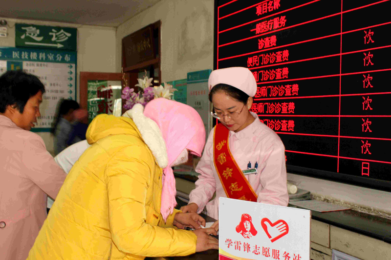 學(xué)雷鋒志愿服務(wù)站工作人員主要由年輕護(hù)士們擔(dān)任。她們身著護(hù)士裝,佩戴印有“學(xué)雷鋒志愿者服務(wù)”字樣綬帶,主動(dòng)為患者服務(wù)。志愿者們提供的主要服務(wù)項(xiàng)目有:在門診為老、弱、病、殘、孕等患者提供輪椅擔(dān)架租借。為患者提供開水、就醫(yī)導(dǎo)診、戒煙勸導(dǎo)、醫(yī)學(xué)人文關(guān)懷、慢性病知識普及和健康宣教等便民利民服務(wù),受到了患者及家屬的一致好評。