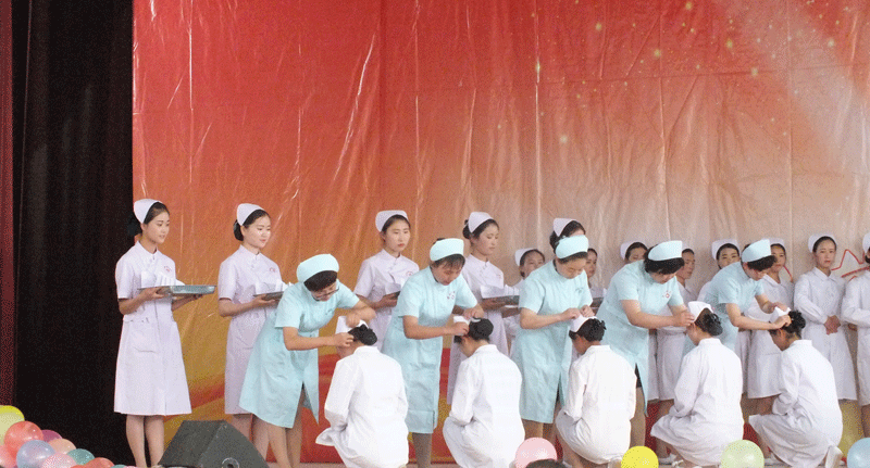 在慶祝活動中,2015級畢業(yè)生代表進(jìn)行“心肺復(fù)蘇技術(shù)”及“右踝關(guān)節(jié)扭傷包扎技術(shù)”表演, 舉行了文藝演出,向全體觀眾展示了護(hù)理系學(xué)生的精神風(fēng)貌與才藝。