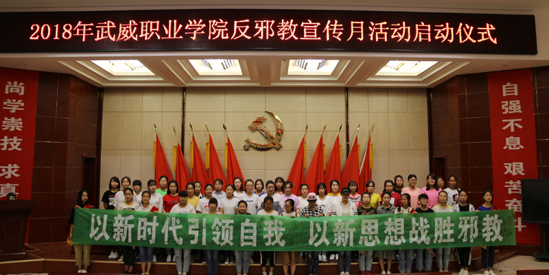 根據(jù)省教育廳印發(fā)的“2018年全省教育系統(tǒng)反邪教宣傳月宣傳周宣傳日活動(dòng)方案”要求,學(xué)院集中開(kāi)展以“抵制邪教、和諧校園”為主題的反邪教宣傳教育活動(dòng)。6月14日,學(xué)院舉行了“武威職業(yè)學(xué)院2018年反邪教宣傳月活動(dòng)啟動(dòng)儀式”及師生簽名活動(dòng),師生代表共220余人參加了啟動(dòng)儀式,啟動(dòng)儀式由宣傳統(tǒng)戰(zhàn)部部長(zhǎng)王繼林主持。