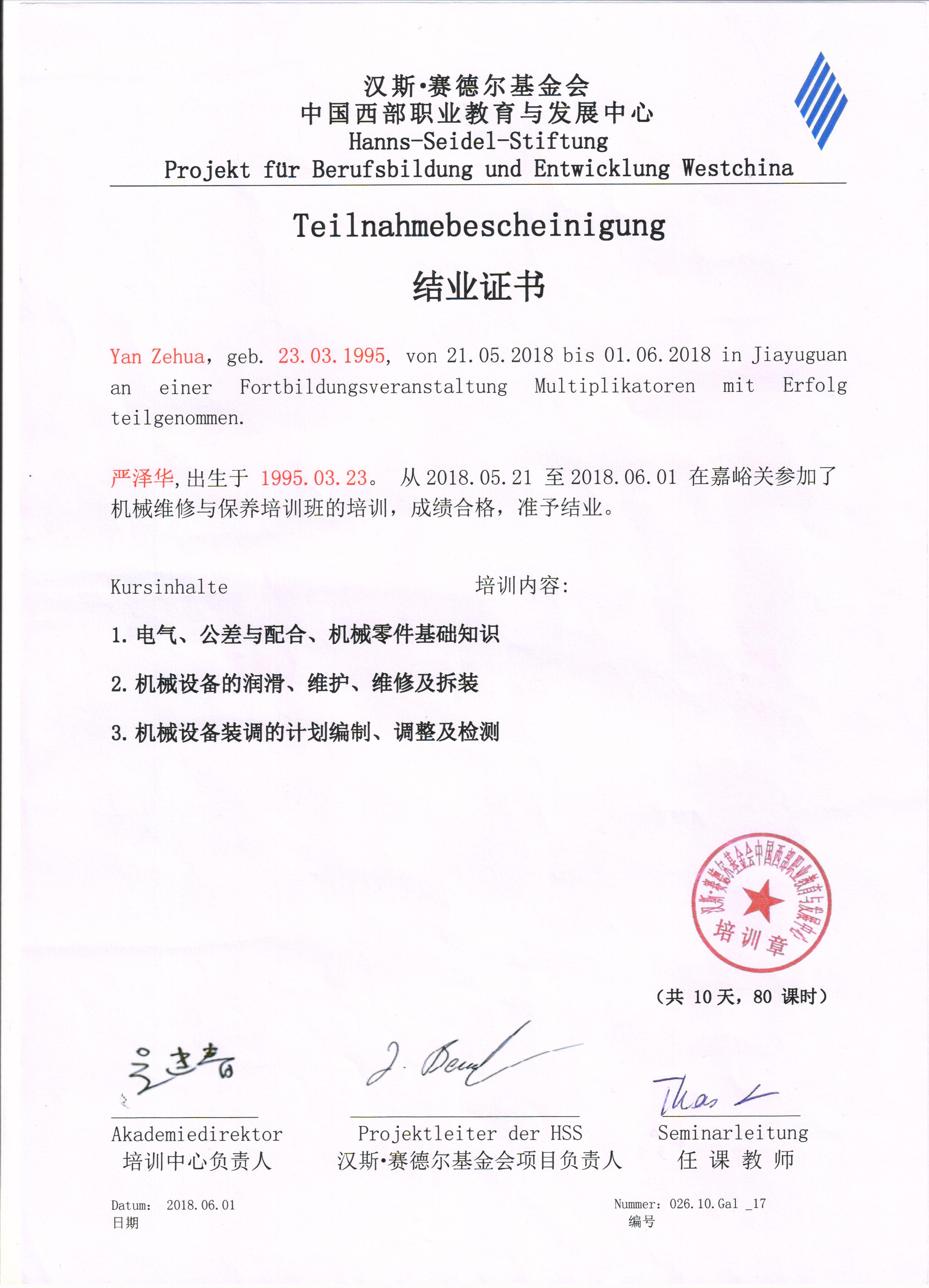 培訓證書--參加漢斯·賽德爾基金會中國西部職業(yè)教育與發(fā)展中心培訓