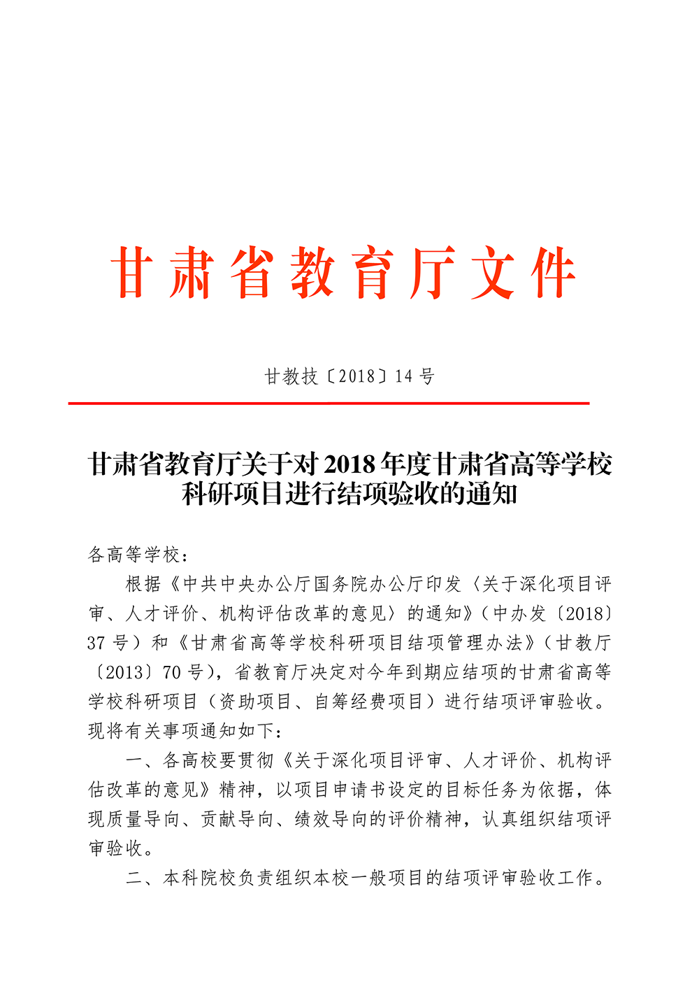轉(zhuǎn)發(fā)甘肅省教育廳關(guān)于對(duì)2018年度甘肅省高等學(xué)??蒲许?xiàng)目進(jìn)行結(jié)項(xiàng)驗(yàn)收的通知