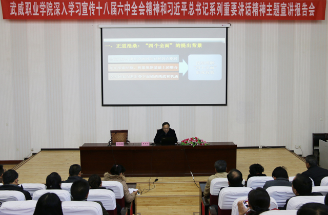 根據(jù)省委和全省宣傳工作會議關(guān)于在全省組織開展深入學(xué)習宣傳十八屆五中全會精神和習近平總書記系列重要講話精神主題宣講活動的通知要求,為向全院黨員干部和師生宣傳好、解讀好十八屆五中、六中全會精神和習近平總書記系列重要講話的實質(zhì)內(nèi)涵和深遠意義,將全會精神和總書記系列重要講話精神作為指導(dǎo)和推動學(xué)院各項事業(yè)快速發(fā)展的科學(xué)理論和強大動力。10月29日上午,“武威職業(yè)學(xué)院深入學(xué)習宣傳十八屆五中、六中全會精神和習近平總書記系列重要講話精神主題宣講報告會”在學(xué)院尚德樓正德廳舉行。會議邀請省委講師團成員、蘭州大學(xué)馬克思主義學(xué)院博士生導(dǎo)師王學(xué)儉教授蒞臨學(xué)院,作題為“四個全面”戰(zhàn)略布局解讀的宣講報告。學(xué)院黨委副書記趙明,副院長王永緒、潘玉華、田迎春,全體中層干部,各部門師生代表共計260余人參加宣講報告會。報告會由田迎春主持。