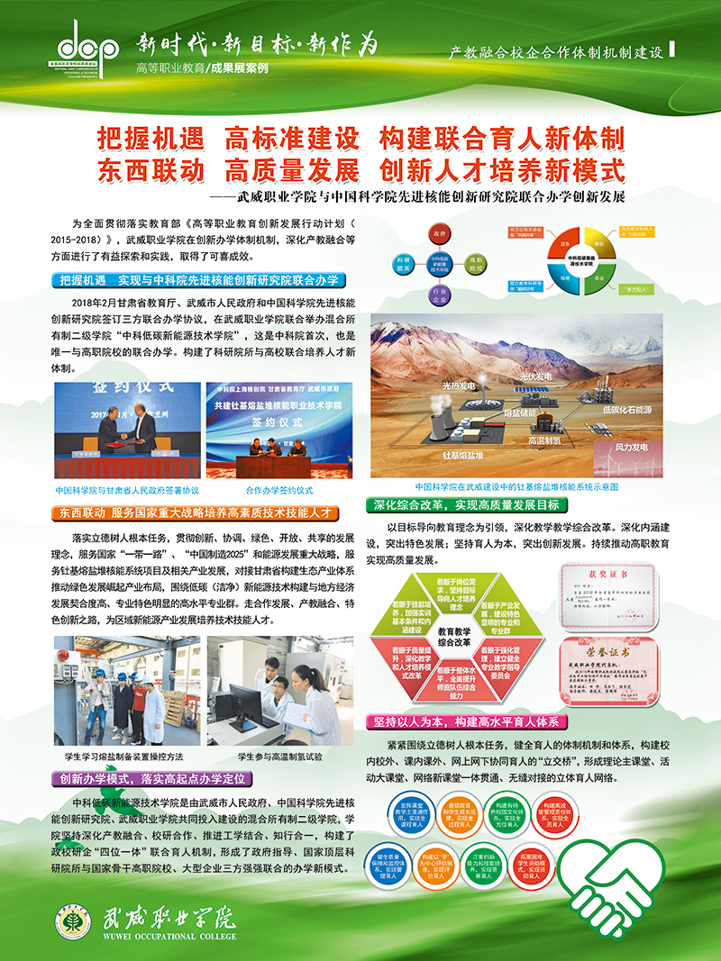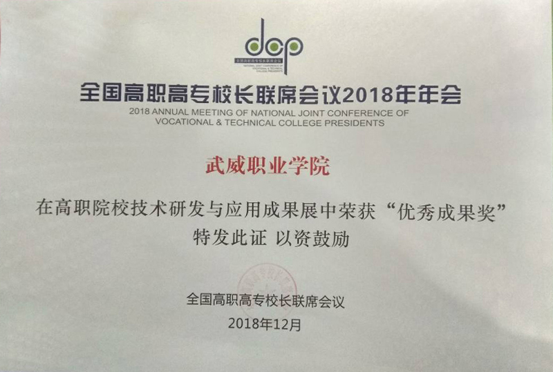 12月8日至9日,學(xué)院黨委書(shū)記、院長(zhǎng)趙明教授、副院長(zhǎng)翟存祥教授帶隊(duì)參加了在福建福州召開(kāi)的全國(guó)高職高專(zhuān)校長(zhǎng)聯(lián)席會(huì)議2018年年會(huì)。學(xué)院自主研發(fā)的“光伏組件智能清潔裝置”榮獲高職院校技術(shù)研發(fā)與應(yīng)用成果 “優(yōu)秀成果獎(jiǎng)”(全國(guó)僅36所高職院校獲此殊榮,甘肅省僅2所),“學(xué)院與中科院先進(jìn)核能創(chuàng)新研究院聯(lián)合辦學(xué)創(chuàng)新發(fā)展”案例入選教育成果案例展。