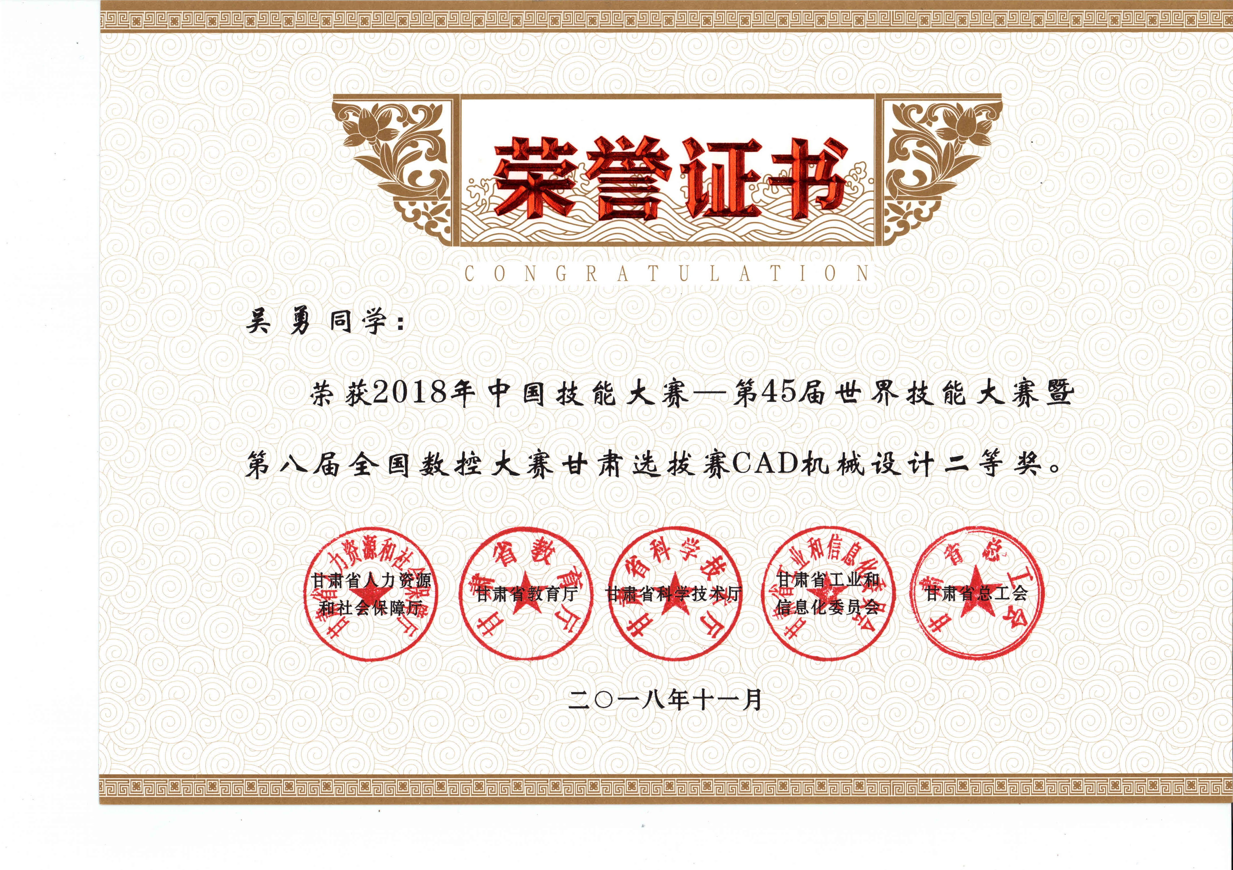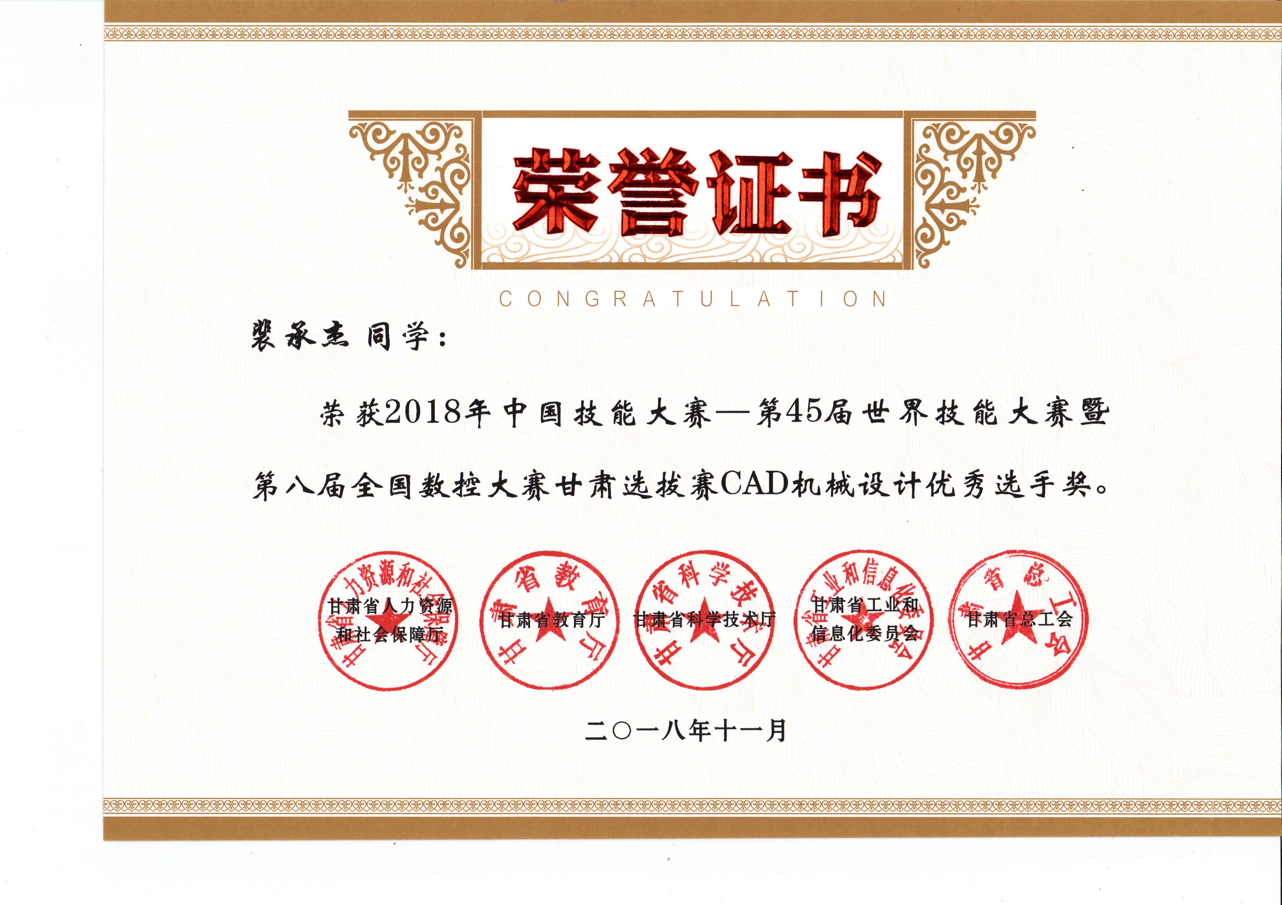 2018年中國技能大賽--第45屆世界技能大賽暨第八屆全國數(shù)控大賽甘肅選拔賽(CAD機械設計項目)獲獎證書