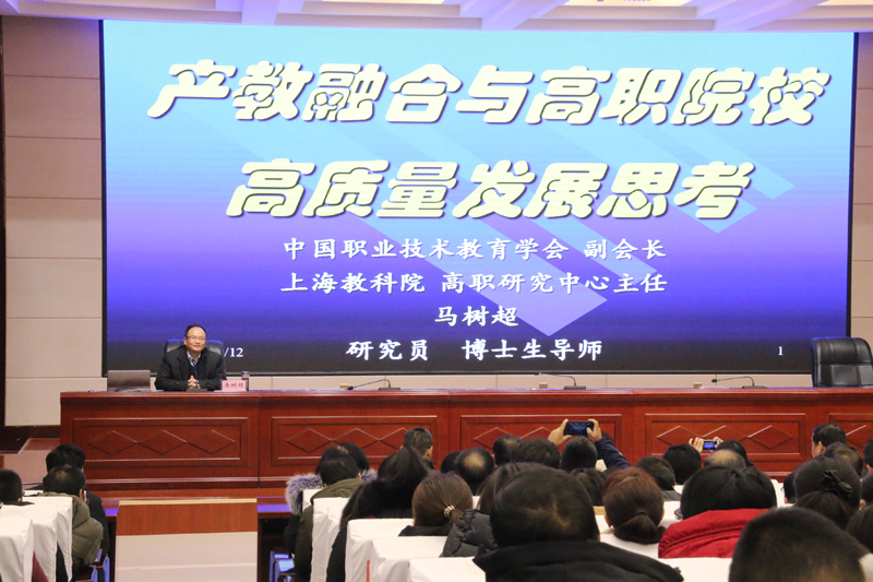 2018年12月11日,學(xué)院邀請(qǐng)到全國(guó)著名職業(yè)教育專家,上海教科院高職研究中心主任,博士生導(dǎo)師、馬樹(shù)超研究員來(lái)我院指導(dǎo)辦學(xué)工作,并作了“綠洲講壇”《產(chǎn)教融合與高職院校高質(zhì)量發(fā)展》主旨報(bào)告。