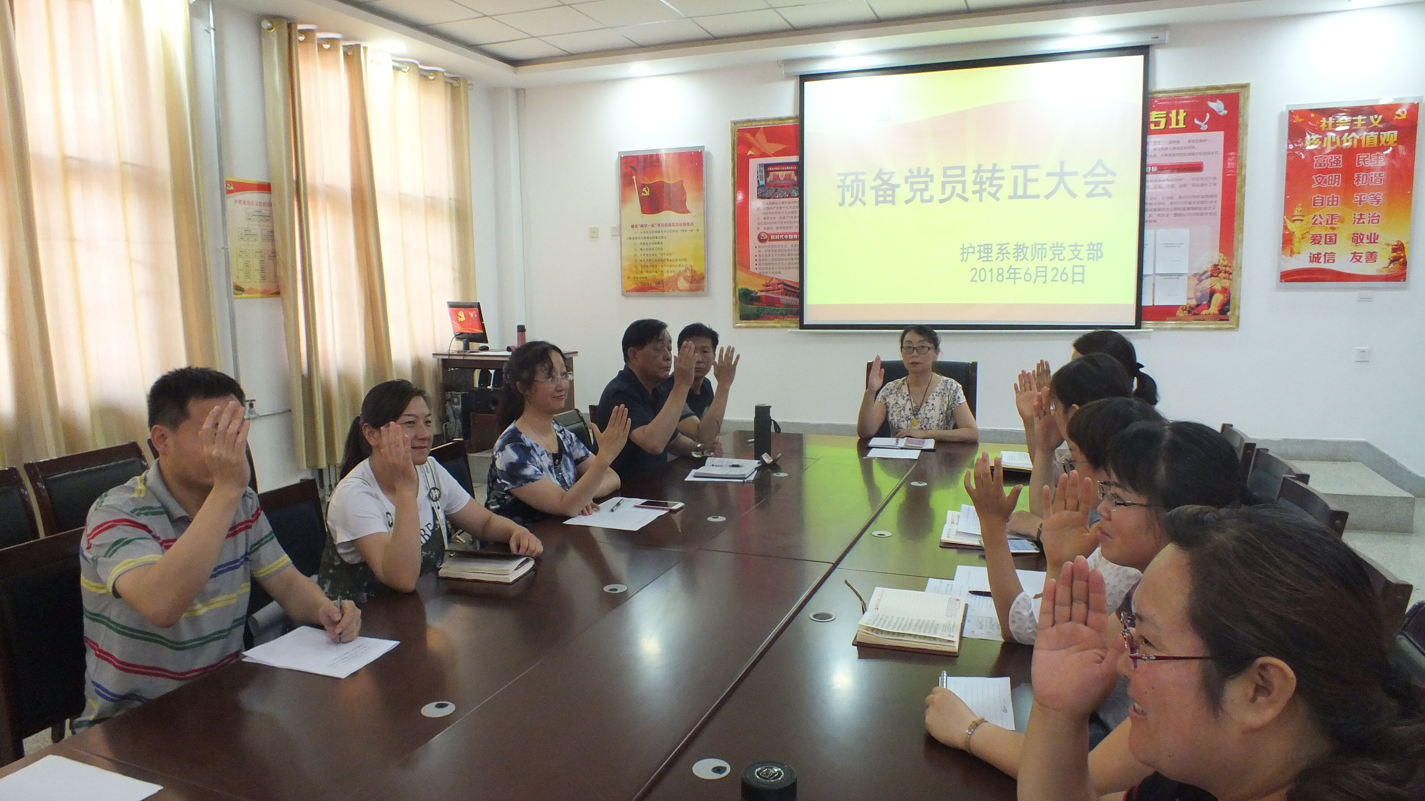 會(huì)議采取申請(qǐng)人暫時(shí)回避的方式進(jìn)行舉手投票,全票通過了預(yù)備黨員的轉(zhuǎn)正申請(qǐng)。最后,支部黨員在韓曉萍的帶領(lǐng)下,與新黨員一同宣讀入黨誓詞。