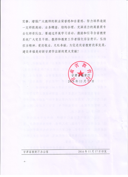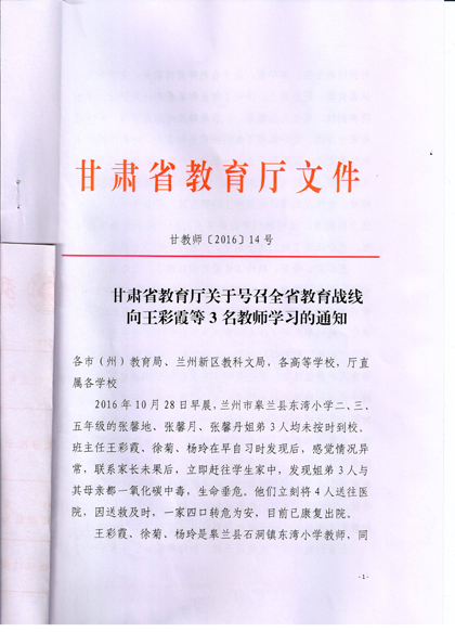 現(xiàn)將《甘肅省教育廳關(guān)于號召全省教育戰(zhàn)線向王彩霞等3名教師學(xué)習(xí)的通知》復(fù)印給你們,請認(rèn)真組織所屬教職工學(xué)習(xí)王彩霞、徐菊 、楊玲3名教師愛崗敬業(yè)、無私奉獻(xiàn)、愛心救人的先進(jìn)事跡。積極在院團(tuán)委、系團(tuán)總支,輔導(dǎo)員和班主任等學(xué)生管理隊(duì)伍中展開學(xué)習(xí)研討活動,深入踐行社會主義核心價(jià)值觀,切實(shí)加強(qiáng)學(xué)院意識形態(tài)領(lǐng)域工作,唱響主旋律,大力弘揚(yáng)正能量。