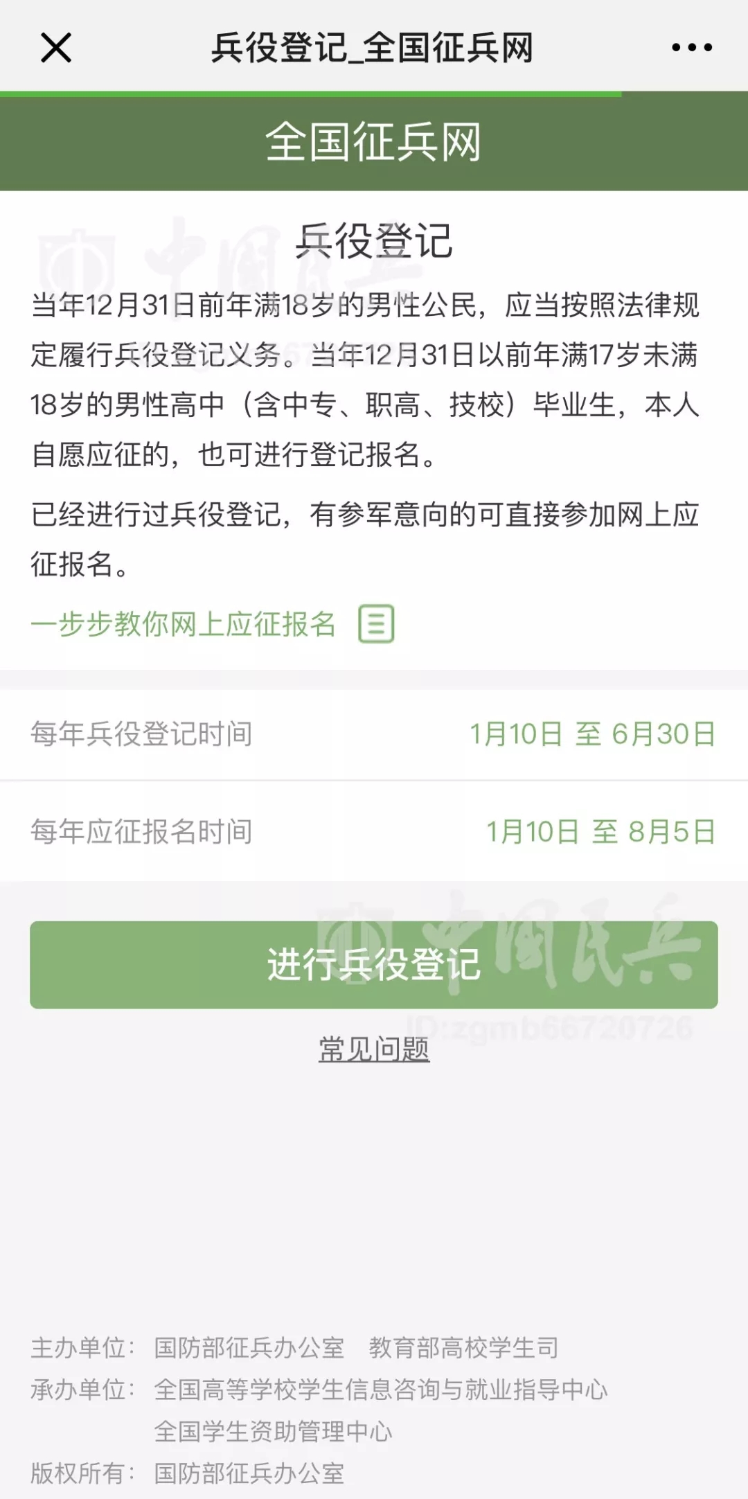 中國民兵北京1月9日電?張東華、記者劉國順報道:日前,國防部征兵辦公室下發(fā)《關(guān)于做好2019年征兵準(zhǔn)備工作的通知》,對新年度征兵準(zhǔn)備工作進(jìn)行安排部署,要求各地深入貫徹習(xí)近平強(qiáng)軍思想,全面聚焦備戰(zhàn)打仗,統(tǒng)籌推進(jìn)征兵組織建設(shè)、能力建設(shè)、法規(guī)建設(shè)、廉政建設(shè),確保高質(zhì)量完成新年度征兵任務(wù),并明確全國征兵網(wǎng)(網(wǎng)址:http://www.gfbzb.gov.cn),或關(guān)注“中國民兵”微信公眾號(ID:zgmb66720726)1月10日正式開通,受理網(wǎng)上兵役登記、應(yīng)征報名和政策咨詢等工作事項。