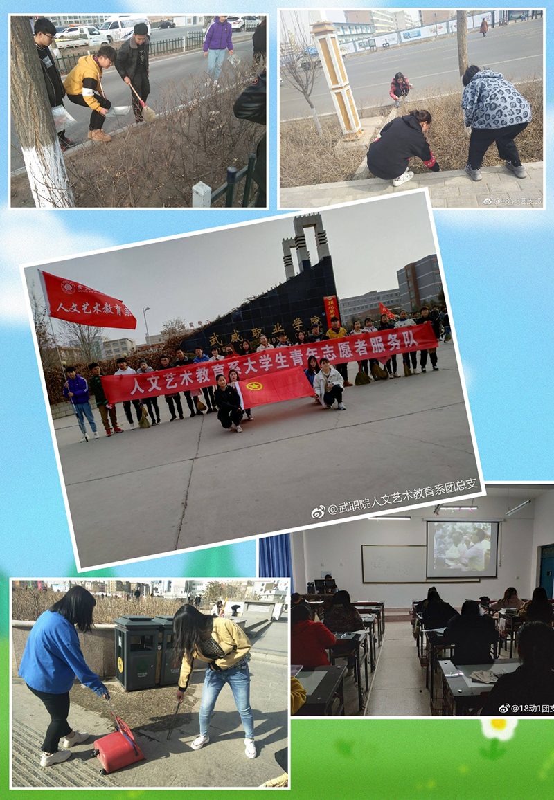 活動(dòng)開始階段,我系組織各班觀看《向雷鋒同志學(xué)習(xí)》的紀(jì)錄片,同時(shí)開展“環(huán)境保護(hù)從我做起”校園服務(wù)活動(dòng),3月9日由系輔導(dǎo)員齊斌文老師帶領(lǐng)志愿者們到武威市文化廣場開展清潔志愿活動(dòng);3月17日由唐鑫基老師帶隊(duì)前往涼州區(qū)高壩敬老院開展志愿服務(wù)活動(dòng);3月29日由馮燕老師帶隊(duì)前往雷臺(tái)公園開展志愿服務(wù)。