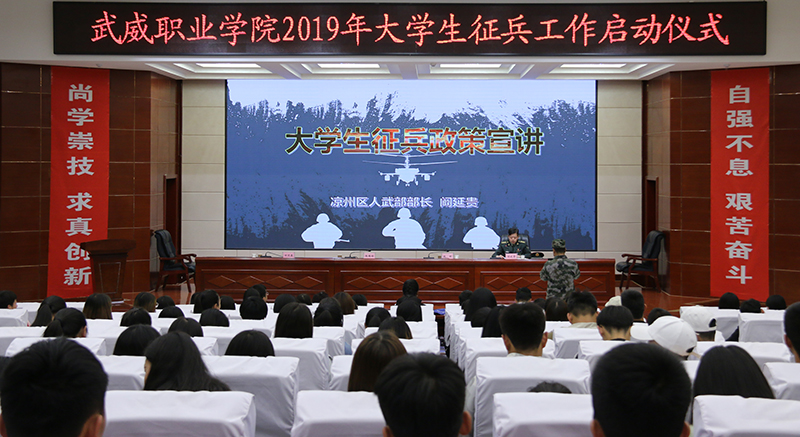 5月9日下午,學(xué)院2019年大學(xué)生征兵工作啟動(dòng)儀式在大學(xué)生活動(dòng)中心菁英廳舉行。武威軍分區(qū)司令員、市征兵領(lǐng)導(dǎo)小組副組長(zhǎng)張國(guó)輝大校,涼州區(qū)人武部部長(zhǎng)、涼州區(qū)征兵領(lǐng)導(dǎo)小組副組長(zhǎng)兼征兵辦公室主任闞延貴上校,學(xué)院黨委書(shū)記、院長(zhǎng)趙明,副院長(zhǎng)田迎春,武威軍分區(qū)動(dòng)員處、涼州區(qū)人武部干部,學(xué)院各系黨總支書(shū)記、輔導(dǎo)員及學(xué)生代表共計(jì)220余人參加了會(huì)議。會(huì)議由田迎春主持。