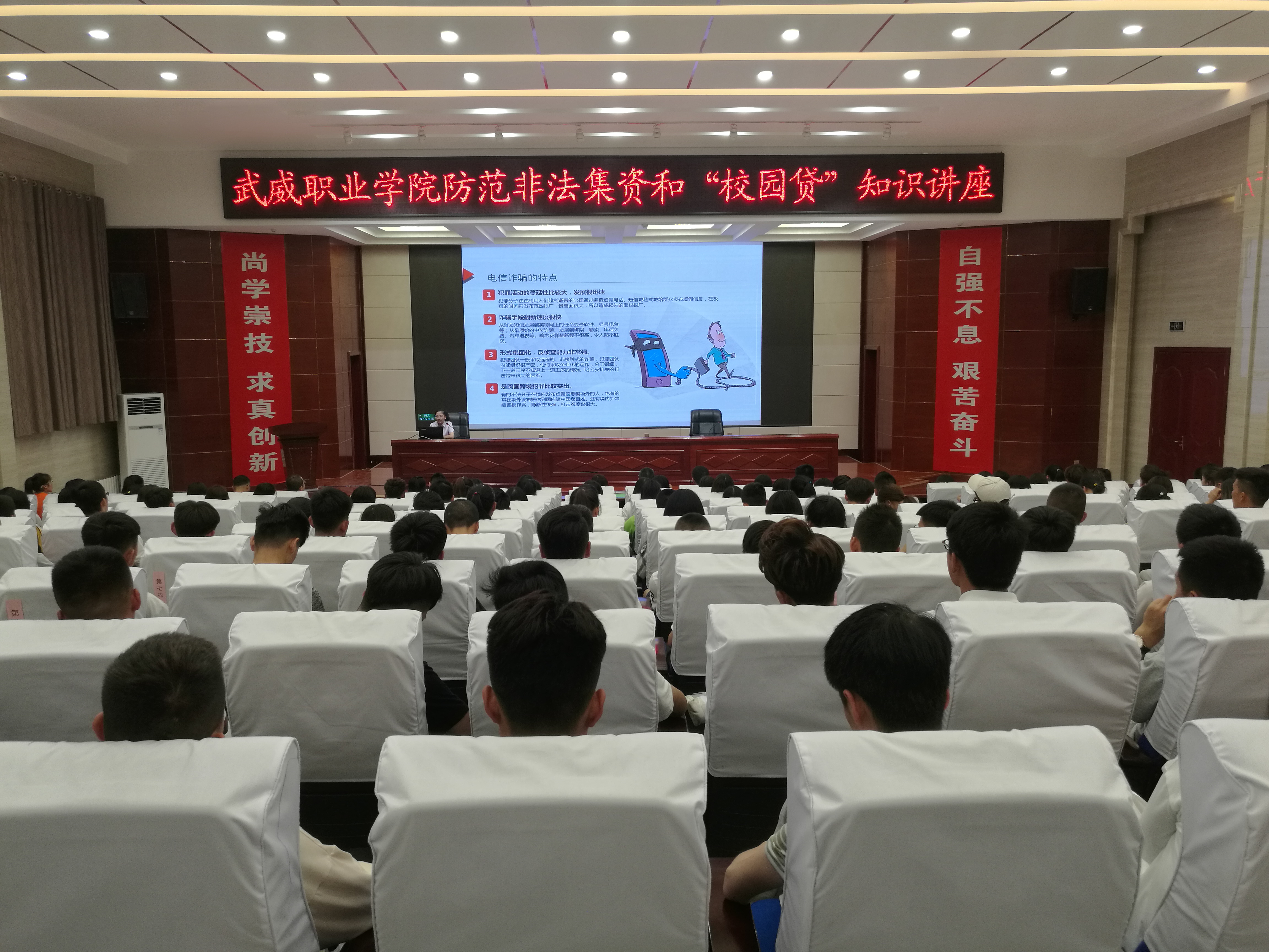 為深入貫徹落實(shí)甘肅省2019年防范非法集資和金融領(lǐng)域掃黑除惡宣傳月活動(dòng)的有關(guān)精神,保護(hù)廣大師生的合法權(quán)益。6月9日晚,學(xué)院邀請(qǐng)中國(guó)農(nóng)業(yè)銀行武威支行風(fēng)險(xiǎn)管理部工作人員朱琳在菁英廳作了關(guān)于防范非法集資和校園貸知識(shí)講座,學(xué)院副院長(zhǎng)王永緒出席活動(dòng),保衛(wèi)處、計(jì)劃財(cái)務(wù)處負(fù)責(zé)同志及各系師生代表200余人聆聽(tīng)了講座。