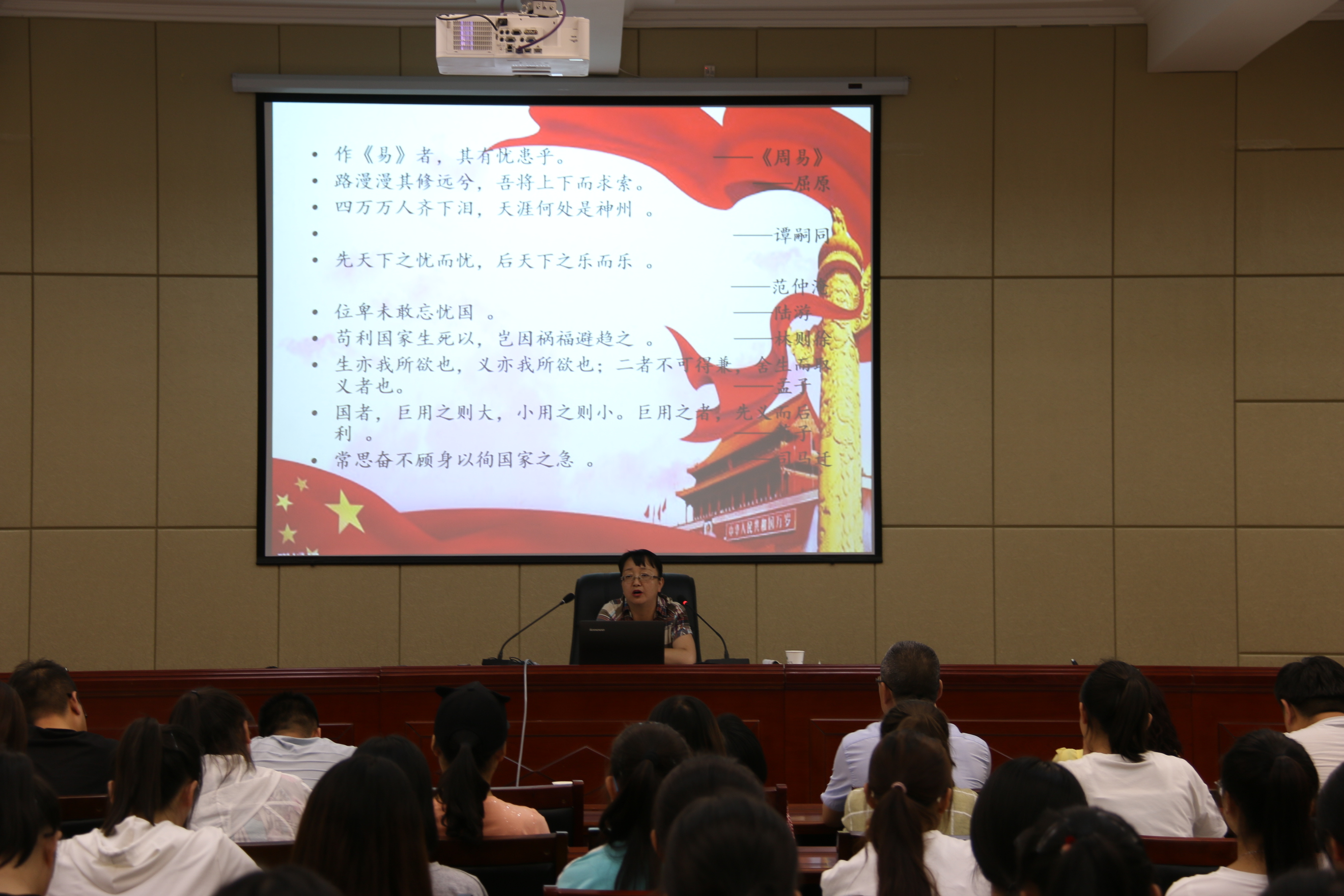 田迎春分別從溯源、求理、踐行三個方面深刻講解了愛國主義精神的傳承與弘揚。一是探尋中華民族愛國主義精神的基因,歷史深刻表明,愛國主義自古以來就流淌在中華民族血脈之中,去不掉,打不破,滅不了;二是洞悉當(dāng)代中國愛國主義的思想真諦,指出對新時代中國青年來說,熱愛祖國是立身之本、成才之基。三是讓愛國主義精神代代相傳、發(fā)揚光大,要求新時代師生要聽黨話、跟黨走,胸懷憂國憂民之心、愛國愛民之情,懂得奉獻祖國、奉獻人民,以一生的真情投入、一輩子的頑強奮斗來體現(xiàn)愛國主義情懷,讓愛國主義的偉大旗幟始終在心中高高飄揚!