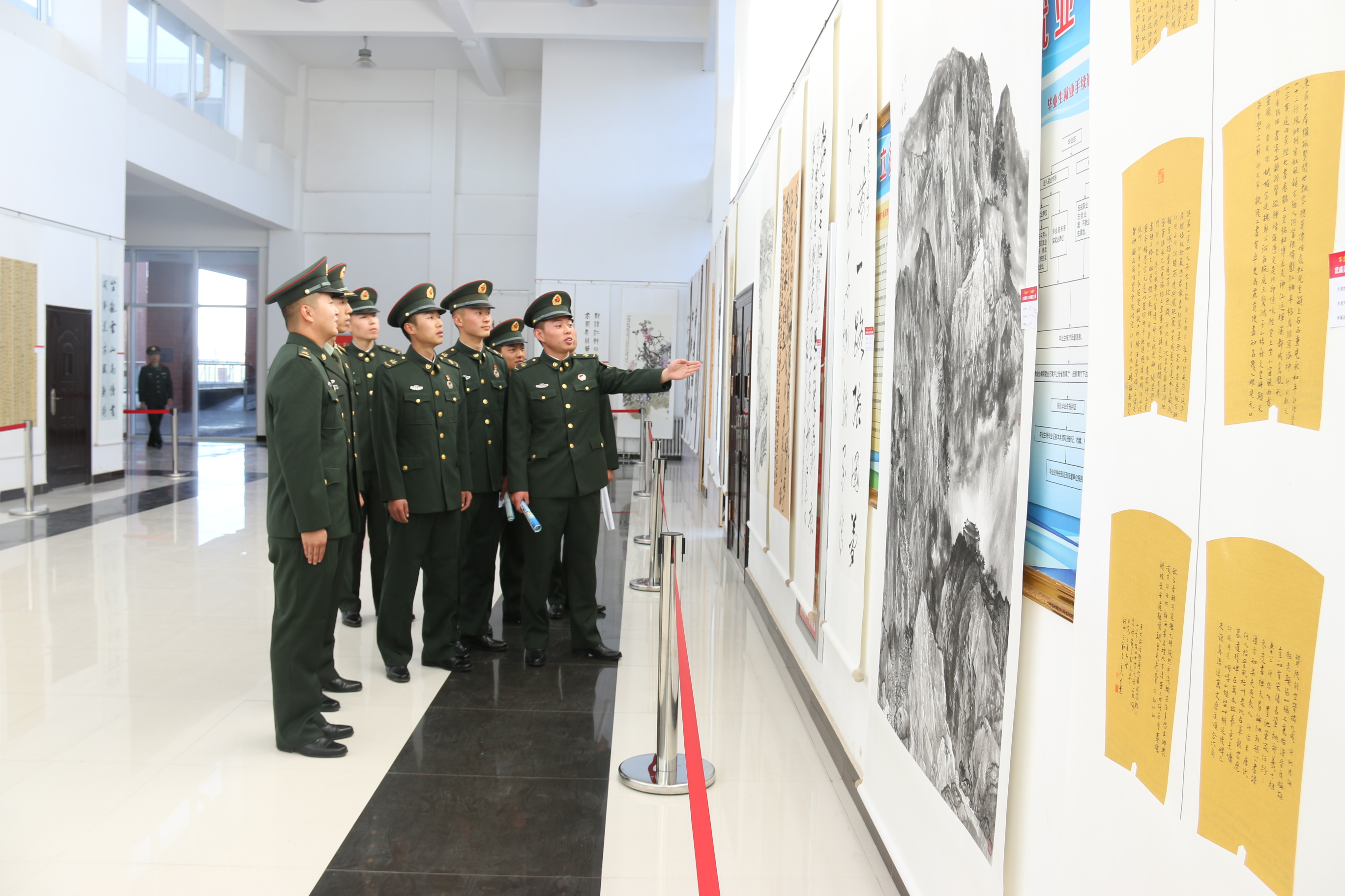為進一步加強師生愛國主義和國防教育,推進學(xué)院“雙擁”工作,促進文化交流,10月18日下午,武威某駐地部隊官兵到學(xué)院參觀 “不忘初心、牢記使命”武威美術(shù)書法作品交流展。學(xué)院黨委委員、副院長何毅,宣傳統(tǒng)戰(zhàn)部、新能源與動力工程學(xué)院辦公室負責(zé)同志,學(xué)院部分師生與部隊官兵一同觀看。