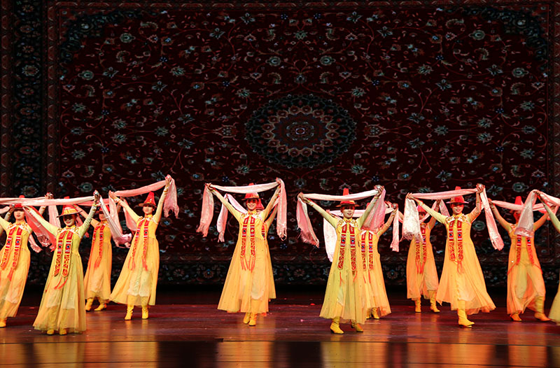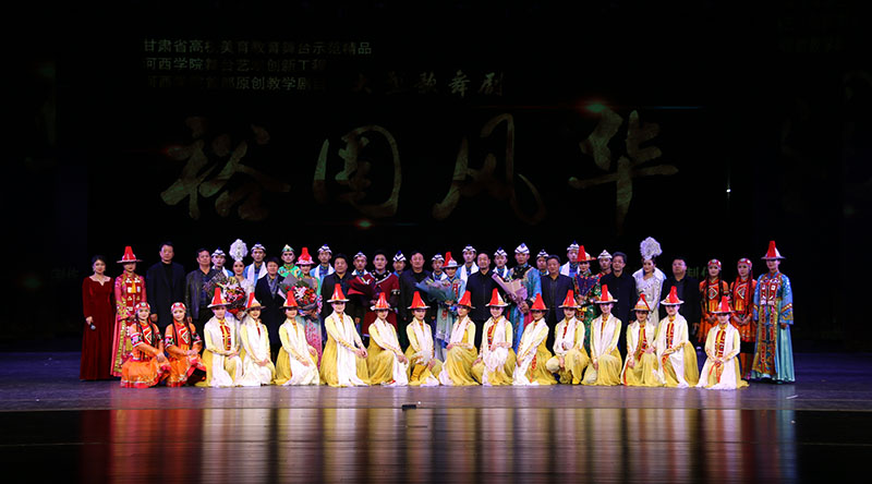 大型歌舞劇《裕固風(fēng)華》是河西學(xué)院師生歷經(jīng)三年精心打造的首部原創(chuàng)教學(xué)劇目,是教育部、文化和旅游部、財政部高雅藝術(shù)進(jìn)校園活動省級巡演劇目,是省委宣傳部和省文旅廳“春綠隴原”展演劇目,是甘肅省學(xué)校美育改革與發(fā)展重大項目、甘肅省高校美育教育舞臺示范精品。全劇由《序》《東遷》《家園》《傳說》《婚禮》五個篇章組成,以裕固族傳統(tǒng)民歌、舞蹈、民俗為載體進(jìn)行創(chuàng)作和改編,以情景歌舞的形式表現(xiàn)裕固族的歷史變遷和民俗文化,以講述、吟誦、歌舞的手法,再現(xiàn)了裕固族的發(fā)展歷史和多姿多彩的獨(dú)特文化,以高品位的藝術(shù)水準(zhǔn)弘揚(yáng)、展現(xiàn)了中華民族傳統(tǒng)文化的優(yōu)良基因和時代活力。