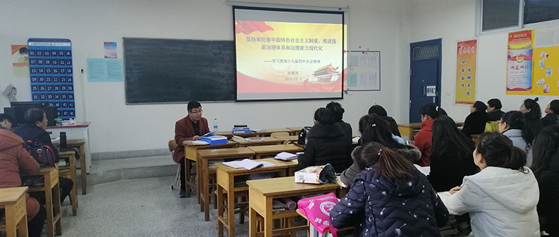 12月3日下午,護(hù)理系在明遠(yuǎn)樓214教室召開宣講黨的十九屆四中全會(huì)精神報(bào)告會(huì),系黨總支書記張建輝同志以《堅(jiān)持和完善中國(guó)特色社會(huì)主義制度、推進(jìn)國(guó)家治理體系和治理能力現(xiàn)代化》為題進(jìn)行宣講,全系教師聆聽了本次報(bào)告會(huì)。