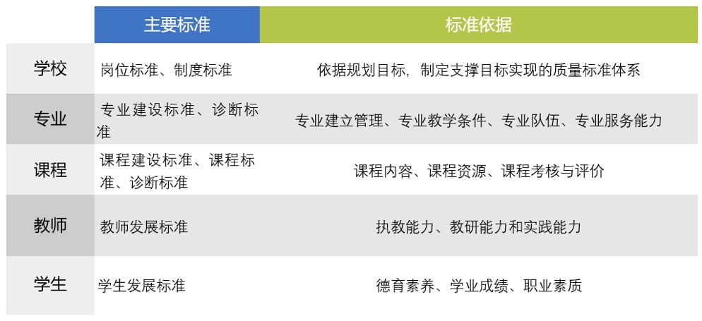 標(biāo)準(zhǔn)制定要體現(xiàn)多元質(zhì)量觀(guān),采用剛性與柔性相結(jié)合的辦法,解決特色發(fā)展與創(chuàng)新發(fā)展的問(wèn)題,堅(jiān)持“目標(biāo)導(dǎo)向與問(wèn)題導(dǎo)向”的統(tǒng)一。從實(shí)際出發(fā),查找問(wèn)題、研究問(wèn)題、解決問(wèn)題,重點(diǎn)解決學(xué)校內(nèi)部治理中存在的“透明管理”等突出問(wèn)題;從專(zhuān)業(yè)建立管理、專(zhuān)業(yè)教學(xué)條件、專(zhuān)業(yè)隊(duì)伍、專(zhuān)業(yè)服務(wù)能力等維度制定專(zhuān)業(yè)建設(shè)標(biāo)準(zhǔn)和診斷標(biāo)準(zhǔn);從課程內(nèi)容、課程資源、課程考核與評(píng)價(jià)等維度制定課程建設(shè)標(biāo)準(zhǔn)、課程標(biāo)準(zhǔn)和課程診斷標(biāo)準(zhǔn);教師發(fā)展標(biāo)準(zhǔn)要以提升教師的執(zhí)教能力、教研能力和實(shí)踐能力為要素;學(xué)生發(fā)展標(biāo)準(zhǔn)要重點(diǎn)考慮學(xué)生的德育素養(yǎng)、學(xué)業(yè)成績(jī)、職業(yè)素質(zhì)。通過(guò)標(biāo)準(zhǔn)體系的打造,形成學(xué)校內(nèi)部質(zhì)量保證體系的標(biāo)準(zhǔn)鏈。