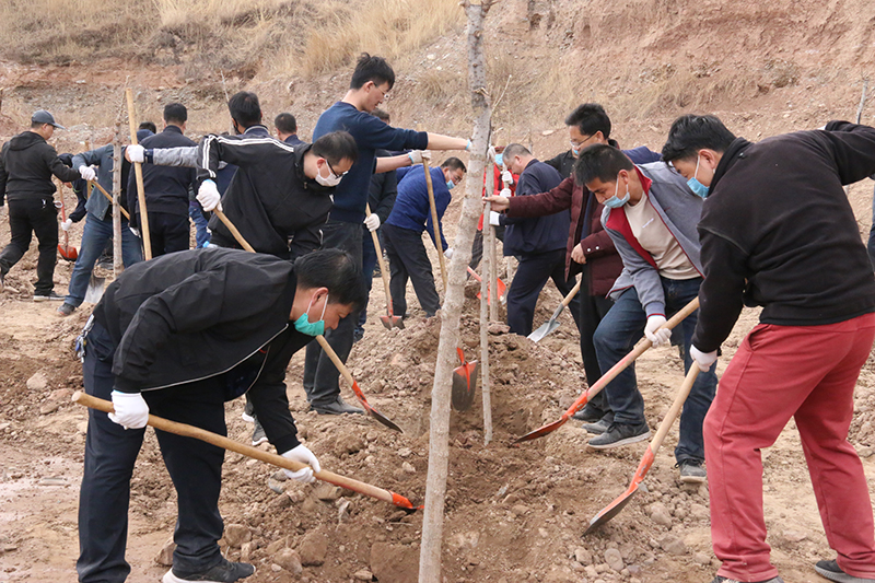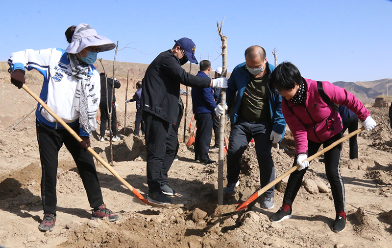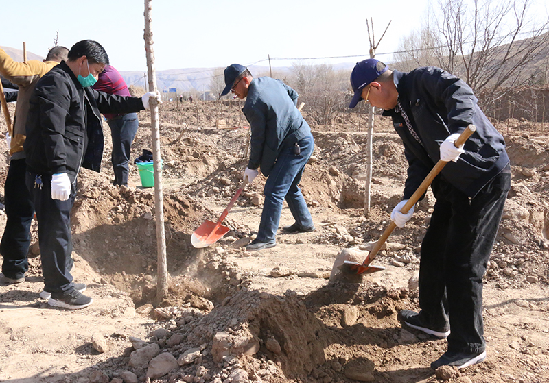 春風(fēng)吹拂處,新綠綻枝頭。為深入學(xué)習(xí)貫徹習(xí)近平總書記視察甘肅的重要講話和批示精神,認(rèn)真踐行綠水青山就是金山銀山的發(fā)展理念,實(shí)施綠色發(fā)展戰(zhàn)略,進(jìn)一步加強(qiáng)祁連山生態(tài)環(huán)境保護(hù)與治理,幫助幫扶鎮(zhèn)打贏脫貧攻堅(jiān)戰(zhàn),實(shí)施鄉(xiāng)村振興戰(zhàn)略,4月9日,學(xué)院領(lǐng)導(dǎo)班子成員、幫扶干部、駐村干部及部分教職工70多人深入結(jié)對(duì)幫扶鎮(zhèn)——黑松驛鎮(zhèn)開展義務(wù)植樹活動(dòng),建設(shè)“生態(tài)示范林”。春光沐浴的祁連山腳下黑松驛鎮(zhèn),春意盎然,生機(jī)勃勃,正是植樹好時(shí)節(jié)。廣大教職工一下車就拿起鐵鍬到植樹現(xiàn)場(chǎng),與黑松驛鎮(zhèn)政府部分干部一起投入植樹活動(dòng),按照“橫看直線側(cè)一線、三埋兩踩一提苗”的技術(shù)要求,三人一組,分工協(xié)作,有序配合,揮鍬培土、扶苖踩土、圍堰澆水,現(xiàn)場(chǎng)一派熱火朝天的勞動(dòng)景象。當(dāng)天植樹育林約20余畝,一棵棵新栽的樹苗整齊排列,迎風(fēng)挺立。通過義務(wù)植樹,廣大教職工用實(shí)際行動(dòng)傳播著生態(tài)文明、綠色發(fā)展理念,切實(shí)幫助幫扶鎮(zhèn)綠起來,美起來,富起來。