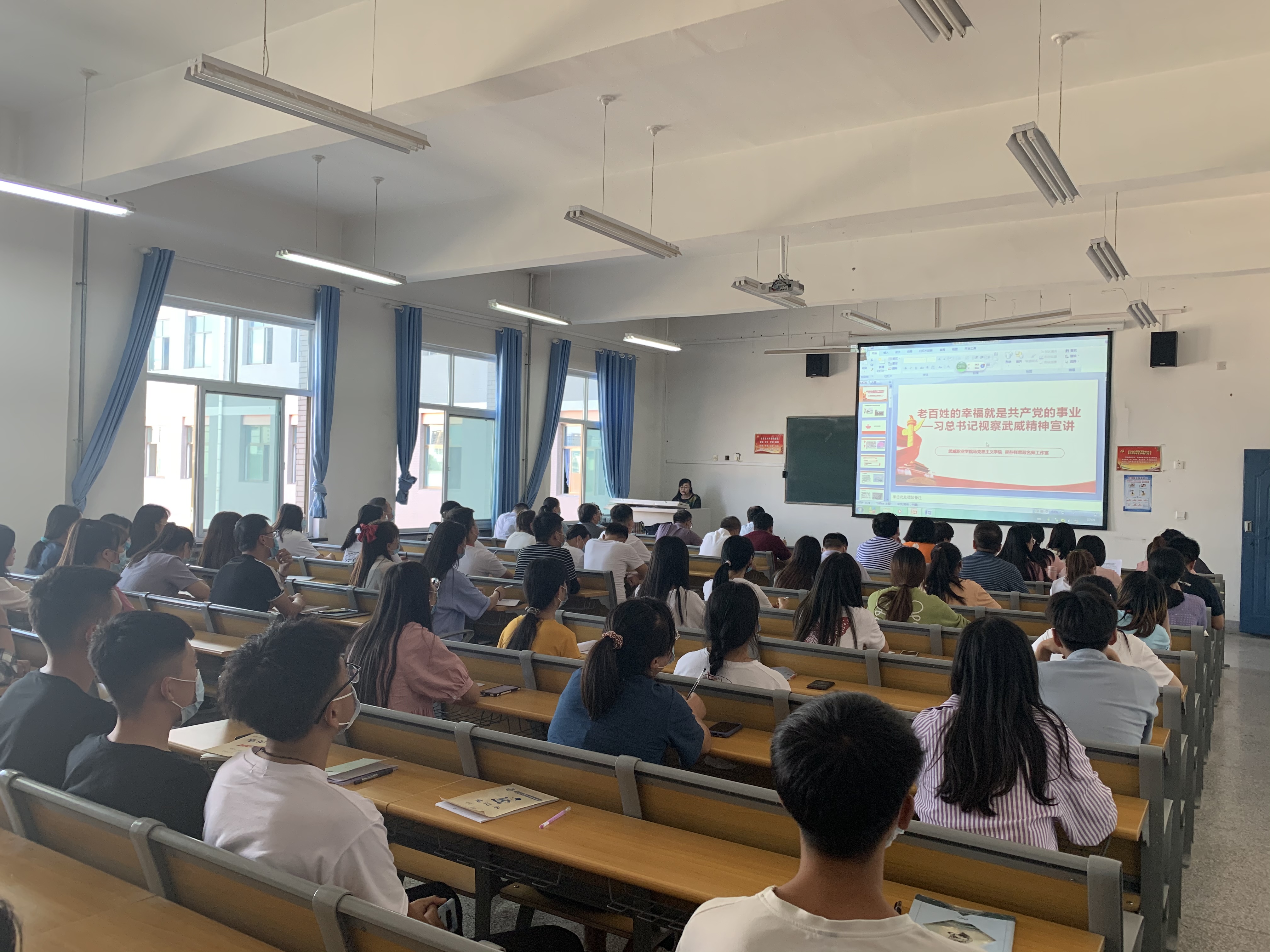 王靜老師圍繞習(xí)近平總書記視察甘肅,特別是2019年8月21日視察古浪縣黃花灘移民區(qū)富民新村社區(qū)和八步沙林場時的重要講話和指示精神,向廣大師生展開深入宣講,闡釋解讀習(xí)近平總書指出的“老百姓的幸福就是共產(chǎn)黨的事業(yè)”的本質(zhì)內(nèi)涵,使習(xí)近平總書記對武威人民的情感關(guān)懷深入人心。