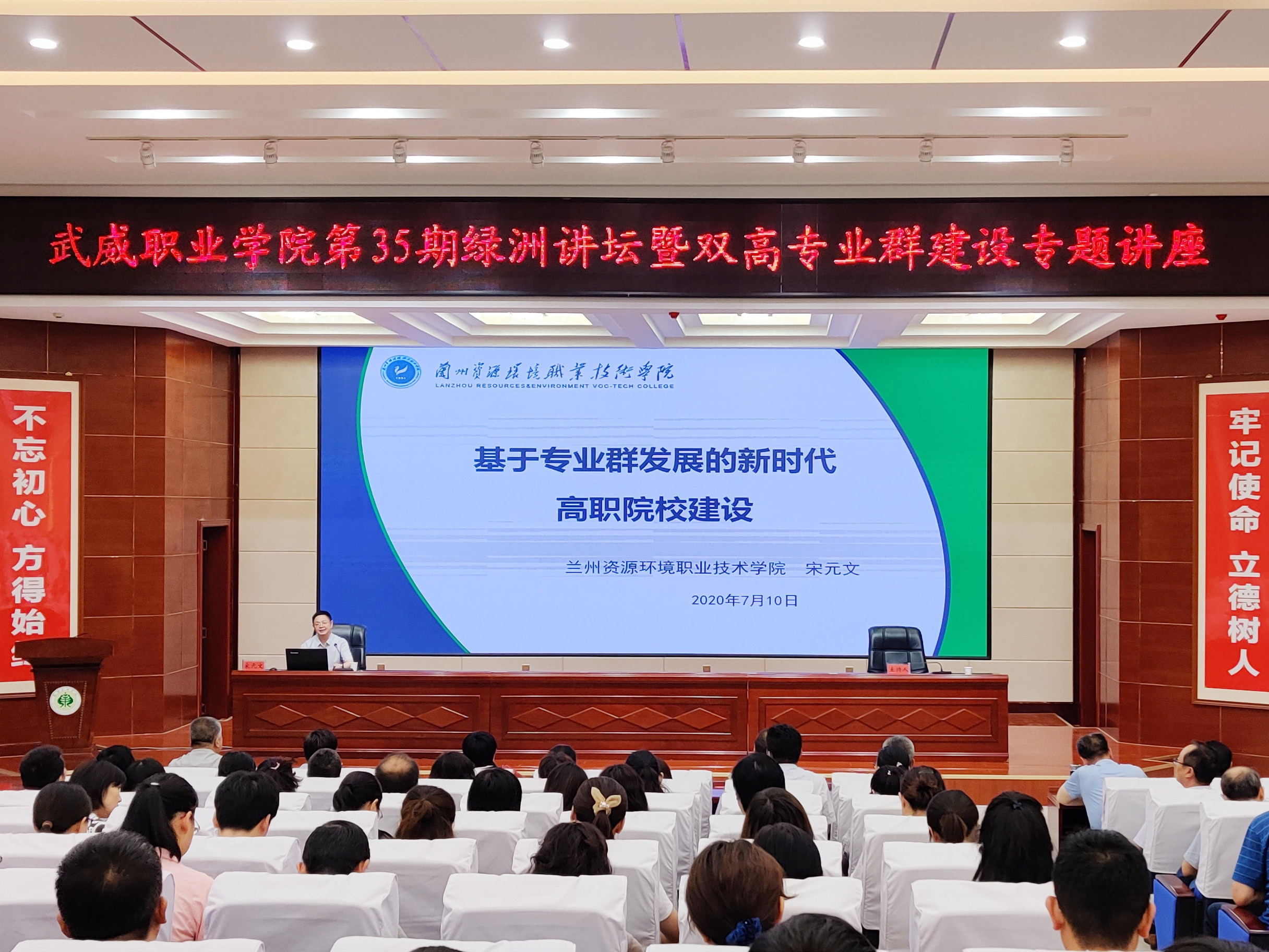 7月11日上午,學(xué)院在大學(xué)生活動中心菁英廳舉辦第35期綠洲講壇暨雙高專業(yè)群建設(shè)專題講座。學(xué)院黨委書記、院長趙明主持報告會,黨委副書記翟存祥,黨委委員、副院長田迎春、何毅、張開禮、王守云,武威職教集團成員單位代表,學(xué)院各部門和教學(xué)院系負責(zé)人、專業(yè)負責(zé)人和教師代表共計200余人參加了報告會。圖為蘭州資源環(huán)境職業(yè)技術(shù)學(xué)院黨委委員、副院長宋元文教授作“基于專業(yè)群發(fā)展的新時代高職院校建設(shè)”專題報告。