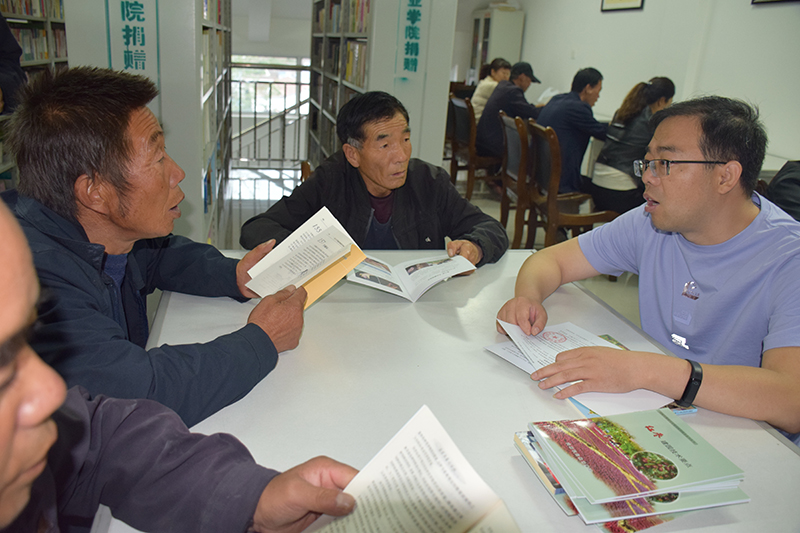 “扶貧先扶智”,晏素珍帶領(lǐng)黨員教師為黑松驛鎮(zhèn)的農(nóng)戶贈(zèng)送了種植養(yǎng)殖及產(chǎn)業(yè)扶貧結(jié)合密切的圖書,之后來到了圖書閱覽室共同交流研討種植養(yǎng)殖的技術(shù)問題,同時(shí)還召開了座談會(huì),就農(nóng)戶急需解決的問題進(jìn)行了詳細(xì)的講解。