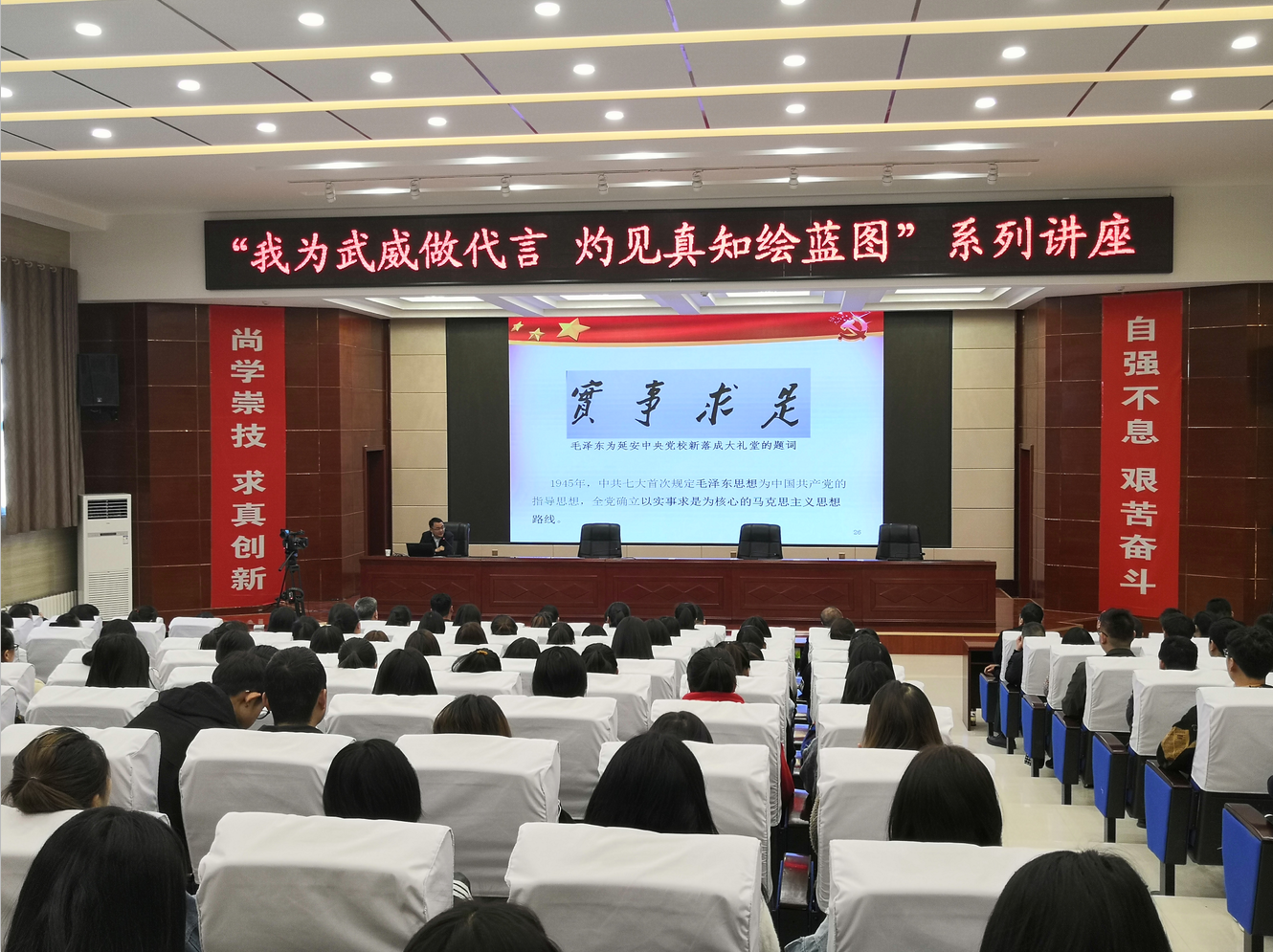 3月16日,武威職業(yè)學(xué)院“綠洲講壇”第12期在學(xué)院菁英廳舉行,本期活動邀請到中國社科院哲學(xué)研究所副研究員、民勤縣委副書記周丹作主題為《掌握看家本領(lǐng) 堅定理想信念》的報告。學(xué)院領(lǐng)導(dǎo)班子、中層干部、師生代表220余人參加了報告會。