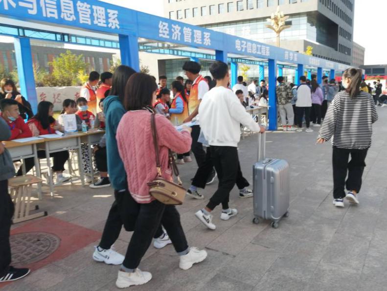 新生報(bào)到注冊在學(xué)院東門口進(jìn)行,為了新生順利完成報(bào)到注冊,學(xué)院在火車站、汽車站分別設(shè)立了接待點(diǎn),每一趟車到站,新生及家長一下車,眾多的迎新志愿者們帶領(lǐng)他們來到報(bào)到點(diǎn),校門口還有我們的廣播員,提醒新生帶好隨身物品,學(xué)院還設(shè)置了家長休息區(qū),綠色通道,來到報(bào)到點(diǎn)還設(shè)有釘釘掃碼簽到,報(bào)到登記處、收費(fèi)處,各項(xiàng)工作有序開展。每個(gè)環(huán)節(jié)均有各系志愿者熱情引導(dǎo),悉心服務(wù),為新生及家長提供新生報(bào)到和問題解答的服務(wù)。迎新工作如火如荼,到處都是忙碌的身影。院團(tuán)委學(xué)生會以及各系團(tuán)學(xué)會的學(xué)長學(xué)姐們不厭其煩地為新生、家長回答著他們提出的各種問題。還幫學(xué)弟學(xué)妹們拎行李,一路談笑風(fēng)生,帶領(lǐng)她們領(lǐng)取床鋪、飯卡,辦理入住等一系列手續(xù),人頭攢動,秩序井然。