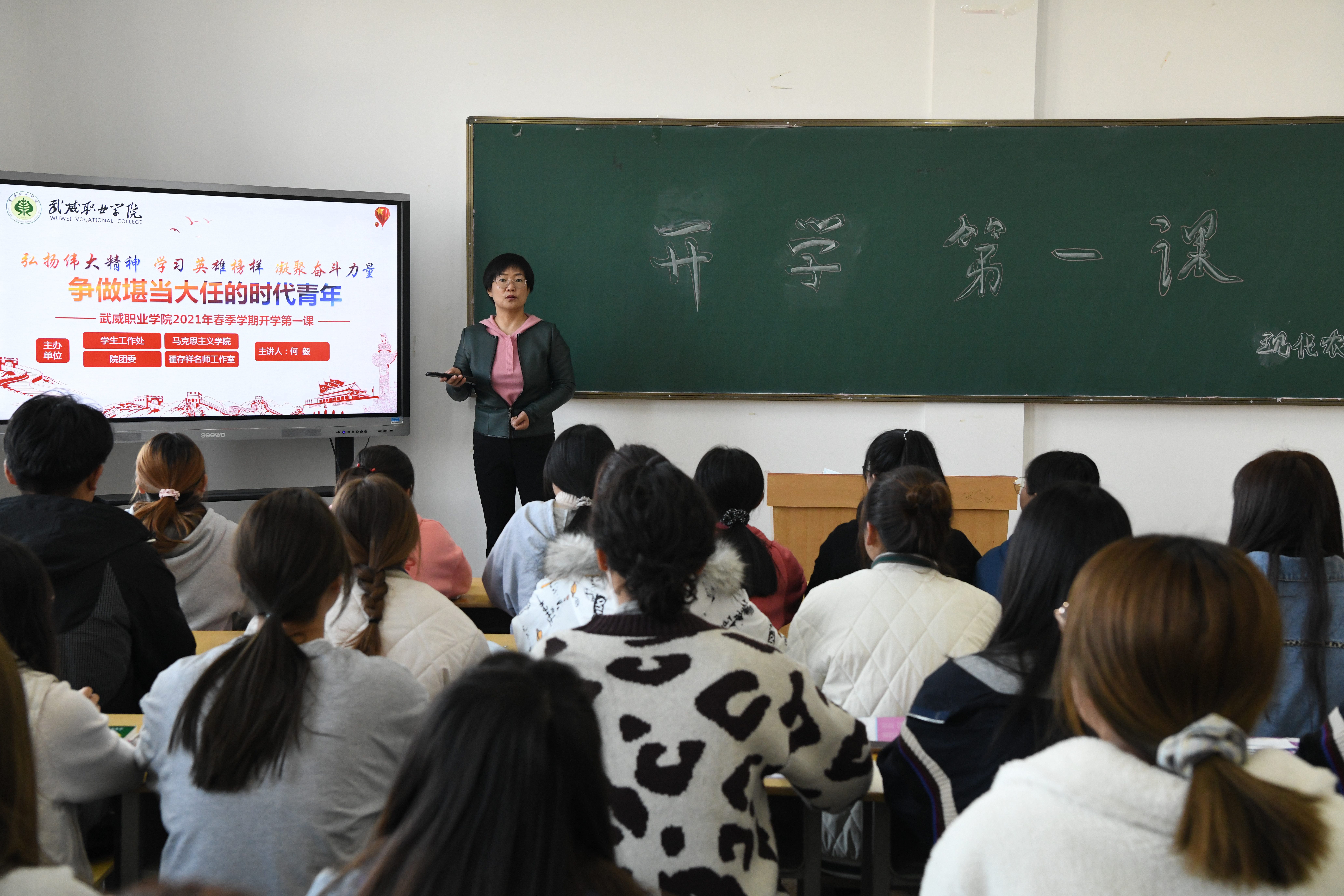 “開學第一課”由學生工作處、院團委、馬克思主義學院、翟存祥名師工作室牽頭組織,采用統(tǒng)一備課、統(tǒng)一講稿、統(tǒng)一內容,由學院領導、思政課教師、工作室成員、全體班主任統(tǒng)一時間、統(tǒng)一講授,對全院8100多名學生進行全全覆蓋開展“開學第一課”教育。
