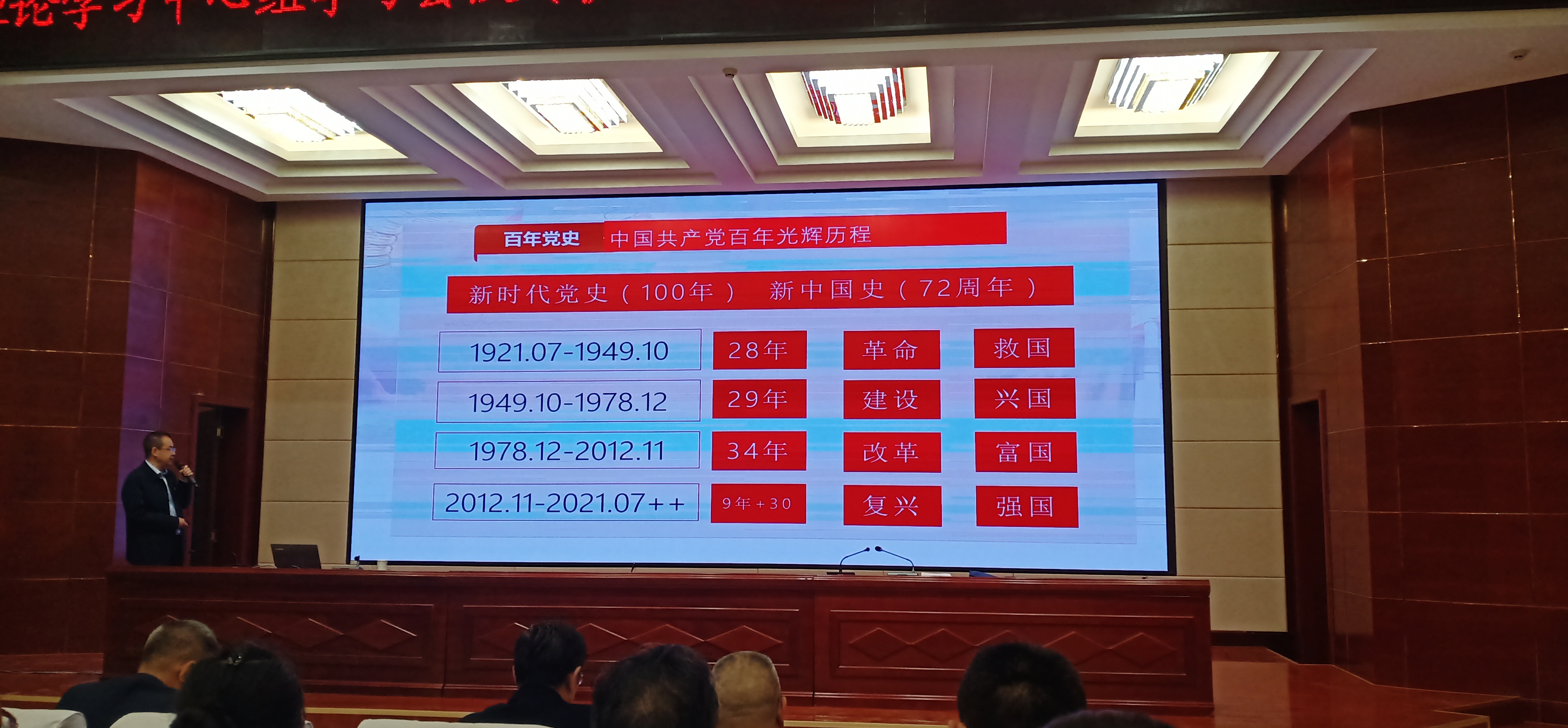 翟存祥教授以《光輝的歷程》為題,詳細講解了黨的百年歷史分成的四個歷史時期、兩大奇跡和只有中國共產(chǎn)黨才能拯救中國等內(nèi)容。通過學習,黨員教師進一步深入了解了中國共產(chǎn)黨百年黨。