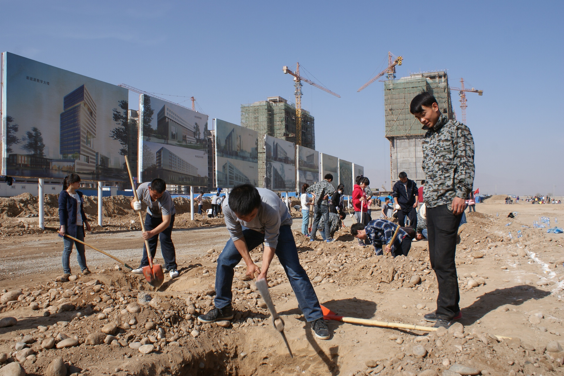 植樹現(xiàn)場一派忙碌的景象,大家有秩序地領取工具,三五一組,分工明確,揮動鎬頭,掘土挖坑,再將一顆顆樹苗埋窩、培土、踩實、澆灌。經(jīng)過三天的緊張勞作,我系師生在指定區(qū)域完成了280個樹坑的開挖和樹木栽植任務。