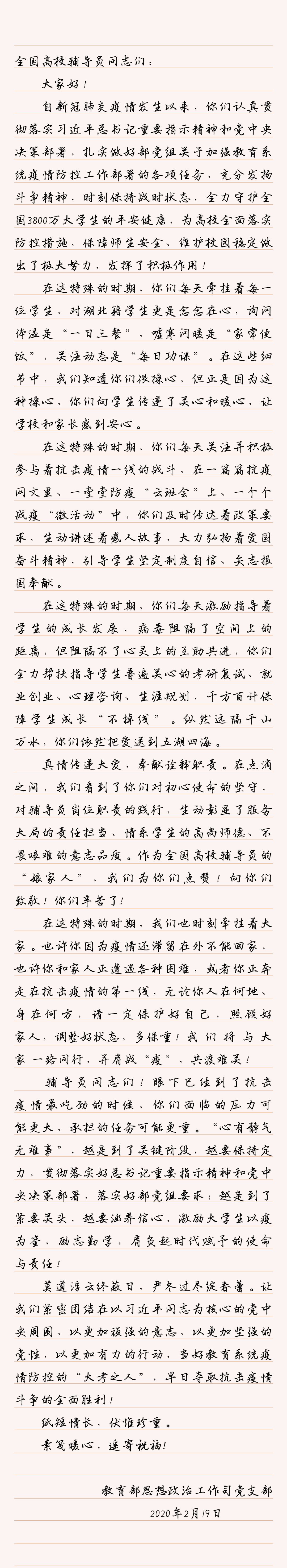 共克時艱 勠力同行 | 教育部思政司黨支部致全國高校輔導員的一封信
