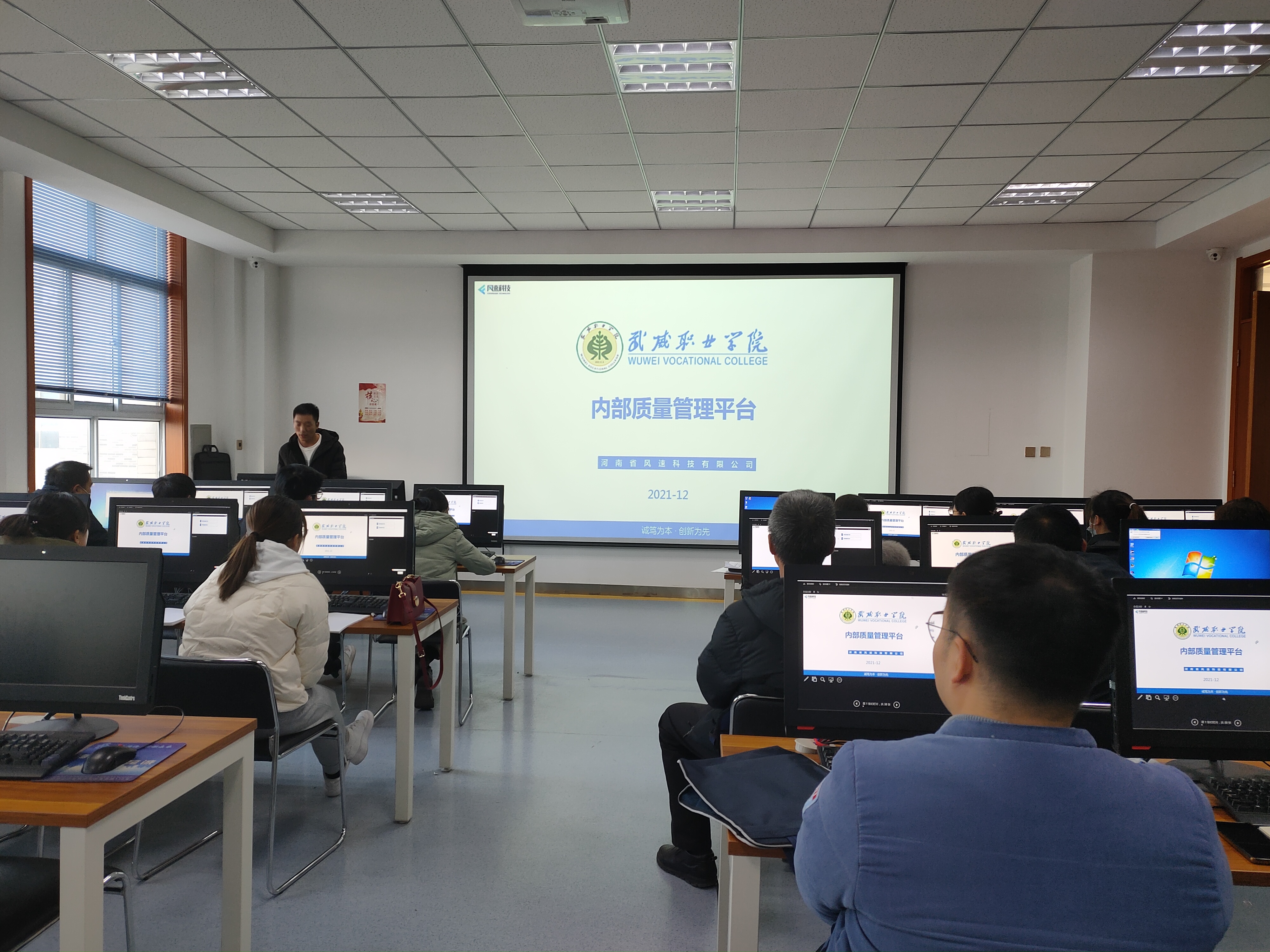 風(fēng)速科技有限公司項(xiàng)目經(jīng)理徐來彬?qū)?huì)教師進(jìn)行了培訓(xùn)。重點(diǎn)介紹了內(nèi)部質(zhì)量管理平臺(tái)整體架構(gòu)、主要功能、任務(wù)提取、上傳、轉(zhuǎn)辦,任務(wù)辦理與審核、通報(bào)、文檔庫上傳與使用、績效考核等,并進(jìn)行現(xiàn)場(chǎng)操作演示,就參會(huì)教師存在的問題進(jìn)行了溝通交流。