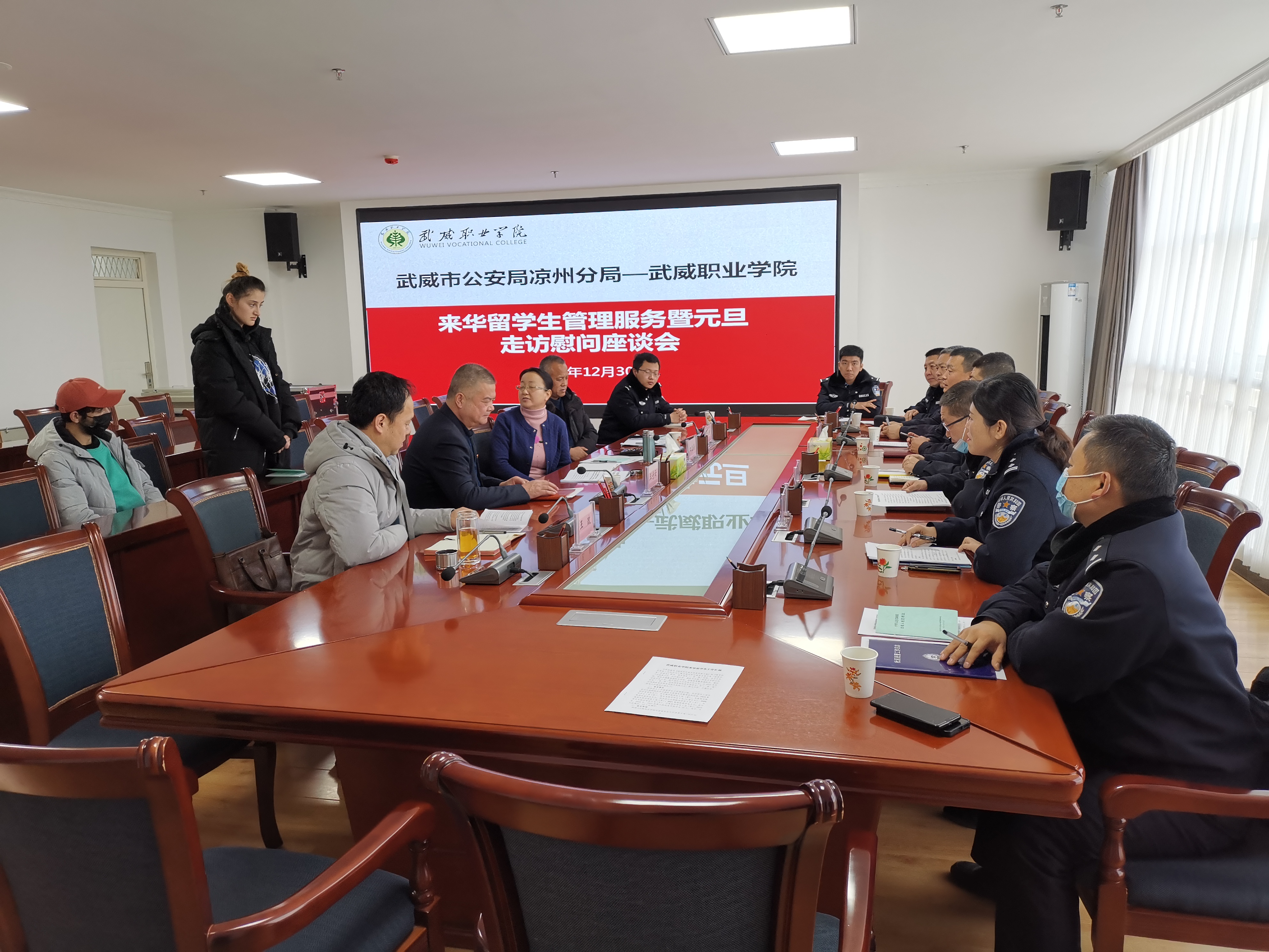 12月30日上午,市公安局出入境管理科、非政府組織管理辦公室,市公安局涼州分局國(guó)安大隊(duì)、反恐大隊(duì)、出入境管理辦公室、涼州分局西關(guān)街派出所一行十一人到訪學(xué)院,開展來華留學(xué)生管理服務(wù)暨元旦走訪慰問活動(dòng)。黨委委員、副院長(zhǎng)田迎春、王守云出席活動(dòng)。國(guó)際合作與交流處處長(zhǎng)潘從民、保衛(wèi)處處長(zhǎng)王政及相關(guān)人員,2019級(jí)、2021級(jí)在華留學(xué)生參加活動(dòng)。田迎春主持活動(dòng)。