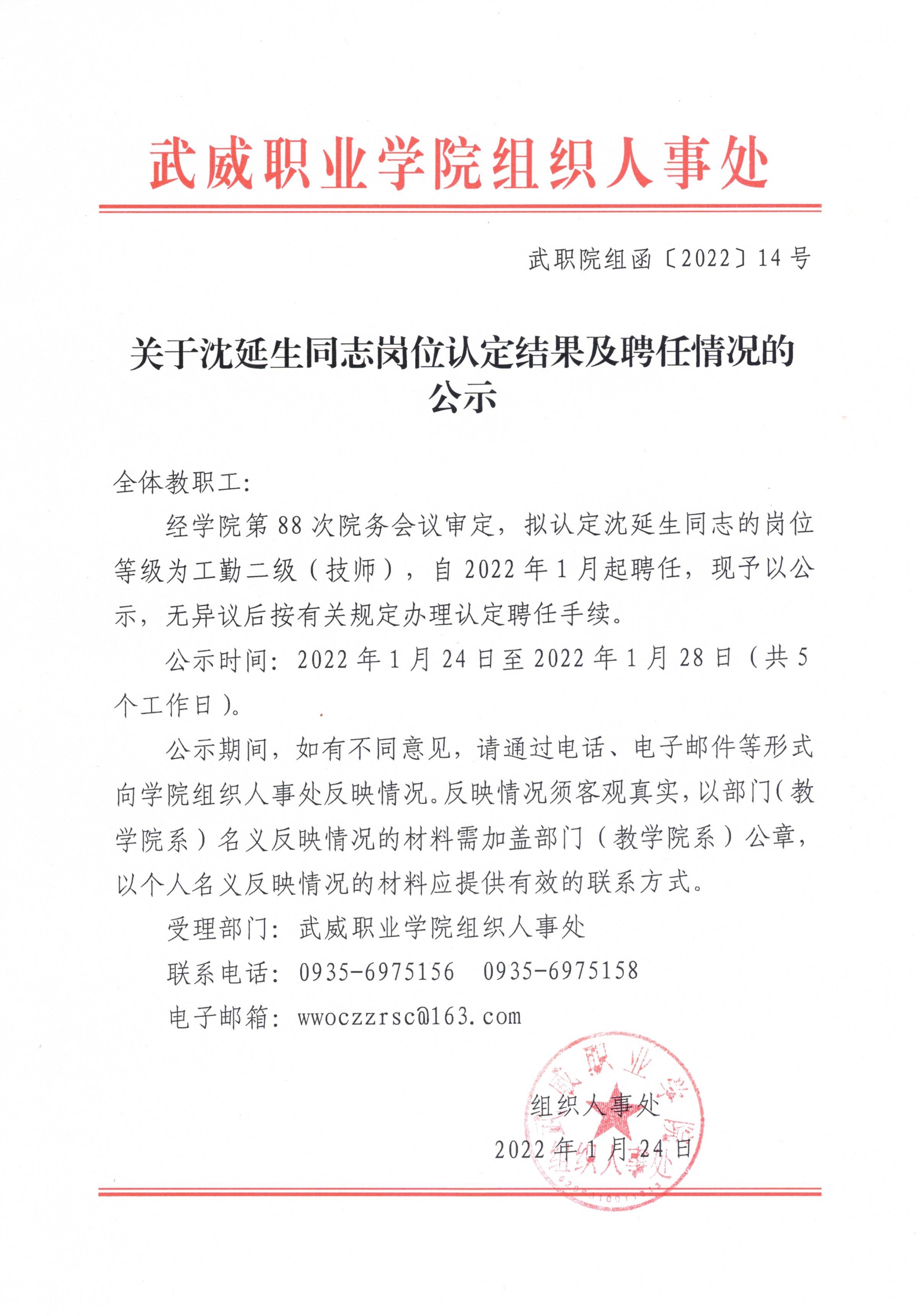 關(guān)于沈延生同志崗位認(rèn)定結(jié)果及聘任情況的公示