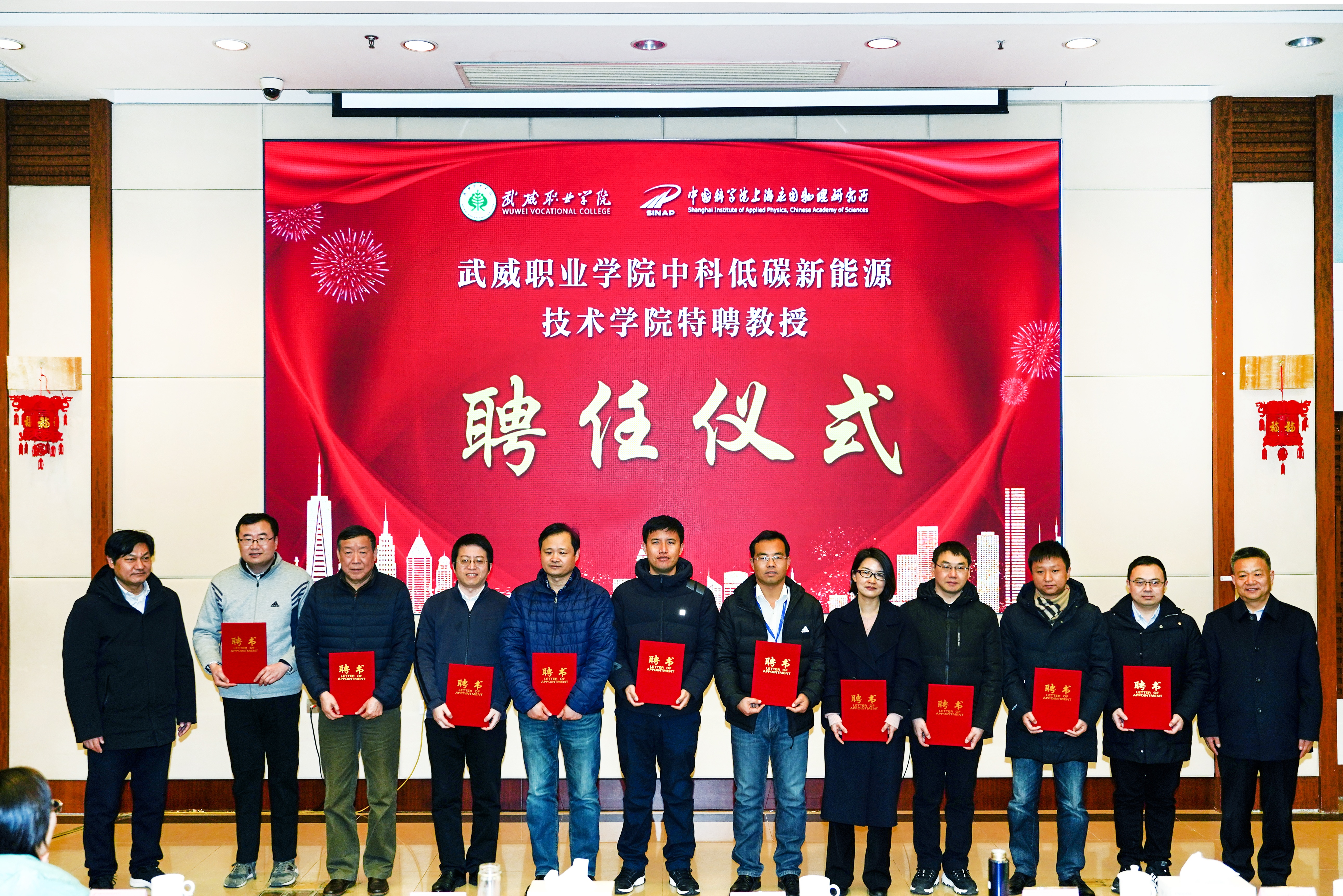 ??聘任儀式上,學院黨委副書記翟存祥宣讀了《武威職業(yè)學院 中國科學院上海應用物理研究所關于續(xù)聘楊存忠等17名同志擔任中科低碳新能源技術學院特聘教授的通知》。隨后,上海應用物理研究所所長戴志敏,學院黨委書記、院長趙明向17名特聘教授頒發(fā)了聘書。