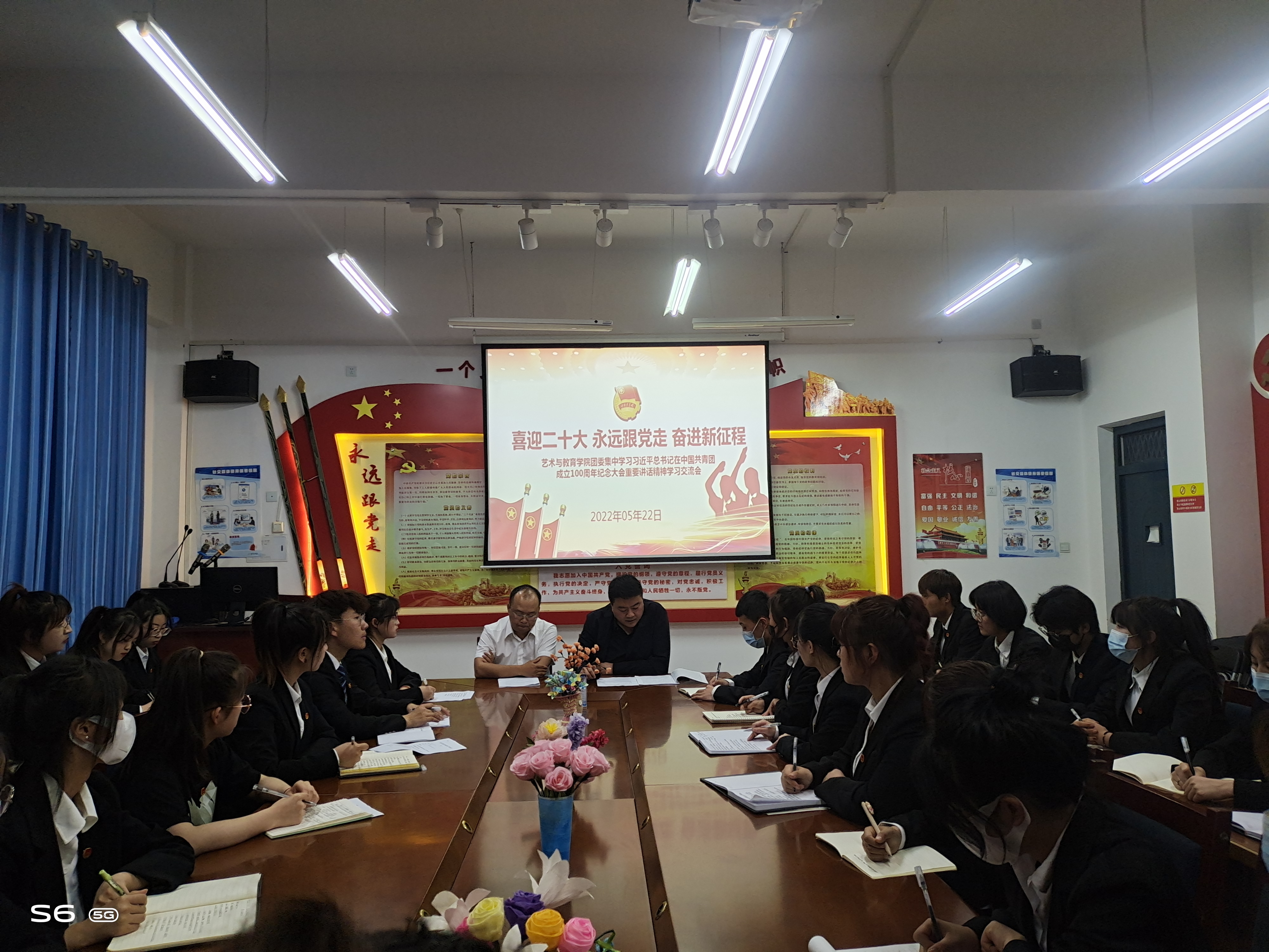 2022年5月22日晚,藝術(shù)與教育學(xué)院團(tuán)委以“喜迎二十大,奮進(jìn)新征程,永遠(yuǎn)跟黨走”為主題,開展習(xí)近平總書記在慶祝中國共產(chǎn)主義青年團(tuán)成立100周年大會(huì)上的重要講話精神學(xué)習(xí)研討交流會(huì),參會(huì)人員由藝術(shù)與教育學(xué)院副院長(zhǎng)李欣,團(tuán)委書記唐鑫基,20、21級(jí)各班團(tuán)支部書記及優(yōu)秀團(tuán)員代表、預(yù)備黨員、入黨積極分子和入團(tuán)積極分子代表組成。