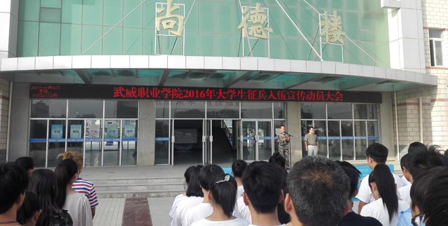 2016年7月5日早晨,學(xué)生工作處聯(lián)合院團委在學(xué)院尚德樓北廣場舉行了“武威職業(yè)學(xué)院2016年大學(xué)生應(yīng)征入伍宣傳動員大會”。學(xué)院1000多名學(xué)生和各系輔導(dǎo)員參加了大會,學(xué)院武裝部部長王守云主持動員大會。