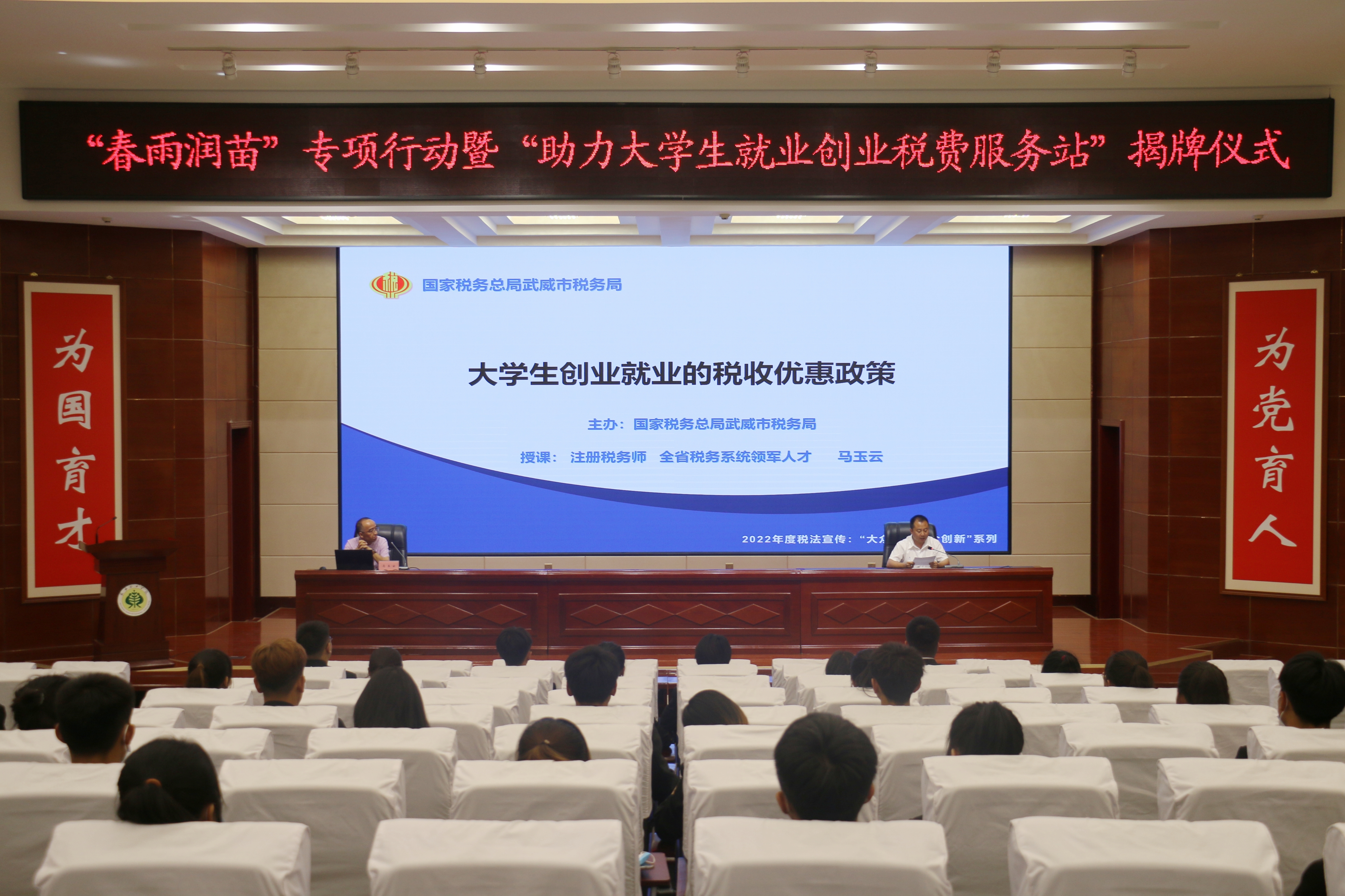 揭牌儀式結(jié)束后,武威市稅費專家顧問團隊代表馬玉云為學(xué)校師生帶來“就業(yè)創(chuàng)業(yè)稅費第一課”的報告,向大學(xué)生們普及稅法知識,特別針對高校畢業(yè)生就業(yè)創(chuàng)業(yè)稅費優(yōu)惠政策、組合式稅費支持政策、個人所得稅政策以及社保繳納等內(nèi)容進(jìn)行了詳細(xì)解讀,為大學(xué)生創(chuàng)業(yè)就業(yè)新苗送上一場“及時雨”。