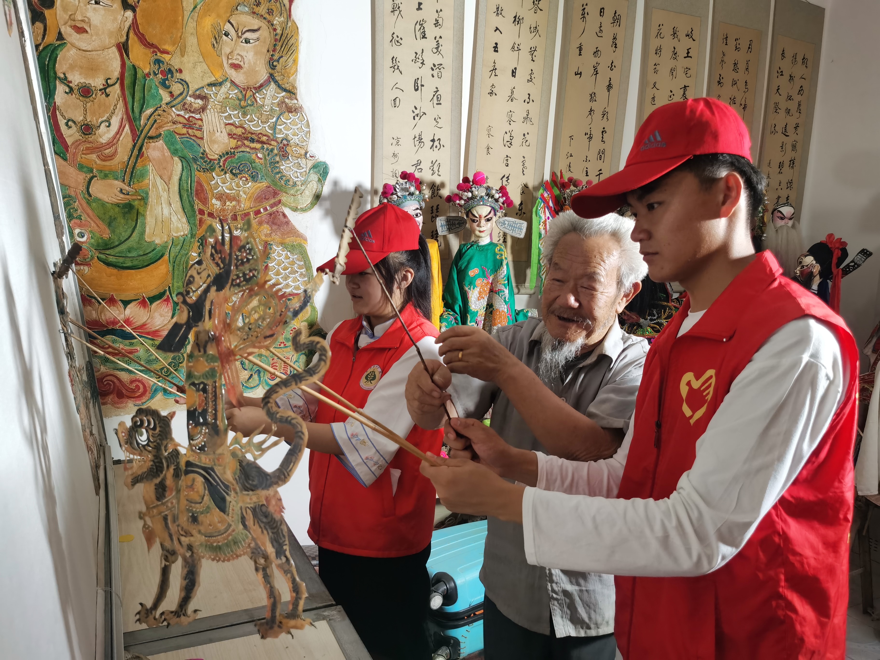 初訪老藝人,馬登岐老人告訴實踐隊員,他5歲開始就跟著爺爺去十里八鄉(xiāng)唱木偶劇、演皮影戲。沒想到,這一演就演了86年。家里的400余件木偶、皮影及木偶人物的道具、服裝都是靠自己雕刻、染色、縫制的,制作一個完整的人物得用一周時間。如今,他家里還珍藏著明清時期的皮影和木偶頭像。