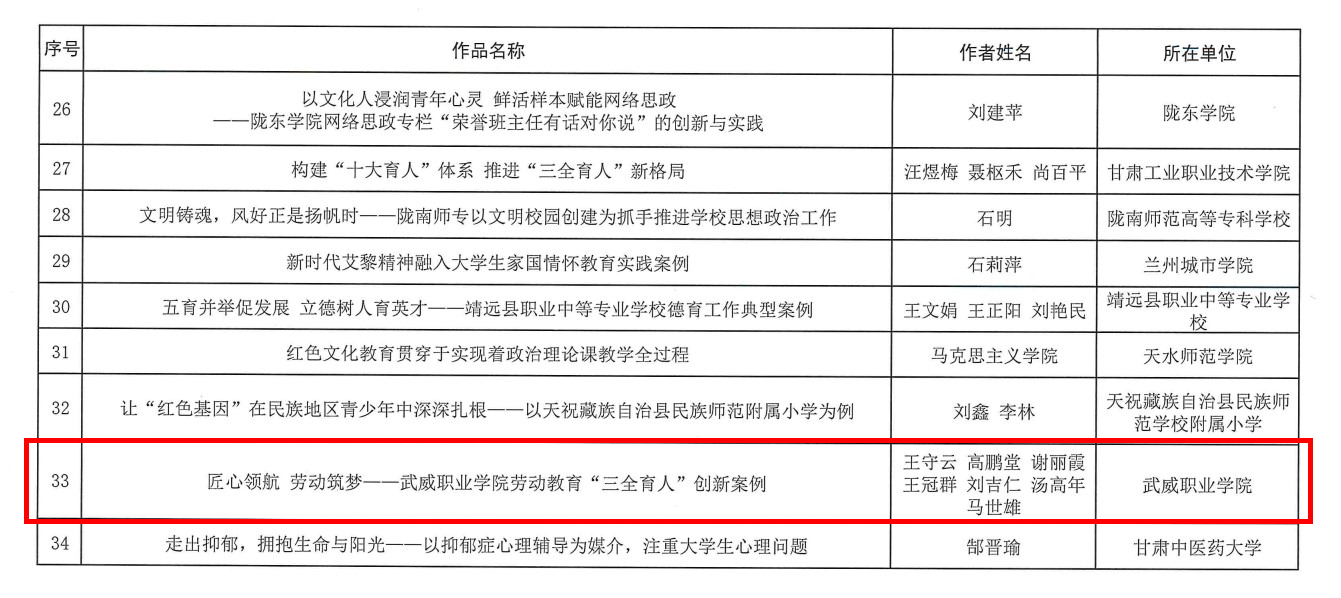 近日,2022年全省學校思想政治教育工作成果征集活動評選結(jié)果公布,武威職業(yè)學院喜獲佳績,兩件作品獲獎。其中,王守云、高鵬堂、謝麗霞、王冠群、劉吉仁、湯高年、馬世雄老師的《匠心領(lǐng)航 勞動筑夢—武威職業(yè)學院勞動教育“三全育人”創(chuàng)新案例》獲思想政治典型案例三等獎;張保海、馮文娟、謝麗霞老師的《基于“診改”的思政教育質(zhì)量評價體系構(gòu)建研究》獲思想政治論文三等獎。