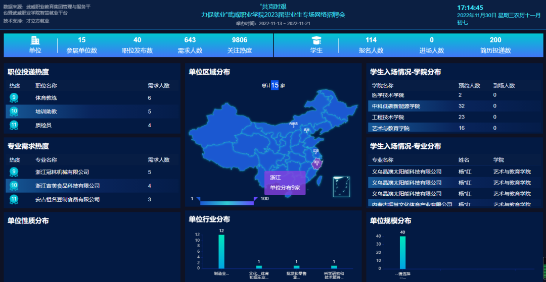 本次云聘系列活動(dòng)分兩個(gè)階段舉行,第一階段為“共克時(shí)艱力促就業(yè)”武威職業(yè)學(xué)院2023屆畢業(yè)生專(zhuān)場(chǎng)網(wǎng)絡(luò)招聘會(huì),于11月7日至11月21日舉行。本次招聘會(huì)主要面向在疫情條件下,能夠?qū)\?chē)接運(yùn)學(xué)生赴企業(yè)就業(yè)的單位。湖州市安吉縣人力資源和社會(huì)保障局組織10余家當(dāng)?shù)仄髽I(yè)參加了本次招聘會(huì),同時(shí)吸引內(nèi)蒙古靈圣作物科技有限公司、江蘇京東信息技術(shù)有限公司、義烏晶澳太陽(yáng)能科技有限公司、內(nèi)蒙古振慧文化體育產(chǎn)業(yè)有限公司等企業(yè)參加,提供招聘職位40個(gè),需求人數(shù)643人,招聘會(huì)關(guān)注人次達(dá)9806,200余人投遞簡(jiǎn)歷。