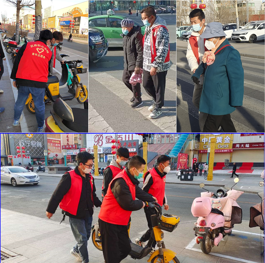 第二組志愿者在文化廣場十字路口配合交警進行文明交通志愿服務(wù),引導大家維護交通秩序,文明出行。幫助行動不便的老人過馬路,整理擺放路邊共享單車,電動車。