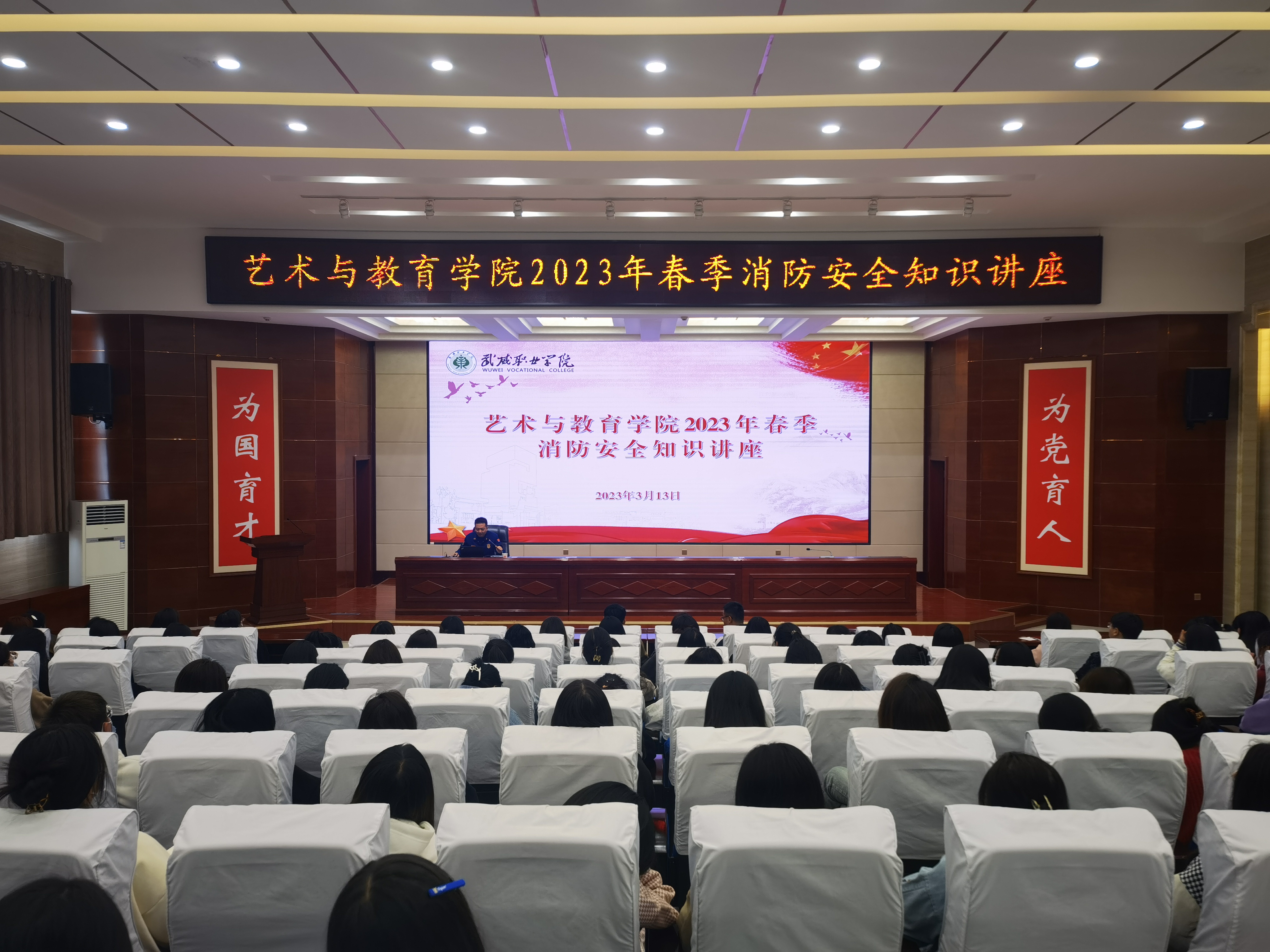 為進(jìn)一步加強(qiáng)我院師生消防安全意識,提升自我應(yīng)變和防護(hù)能力。近日,藝術(shù)與教育學(xué)院在大學(xué)生發(fā)展中心菁英廳開展了消防安全知識講座。講座由武威市消防救援支隊涼都特勤站站長武子奇主講,200多名師生參加講座。