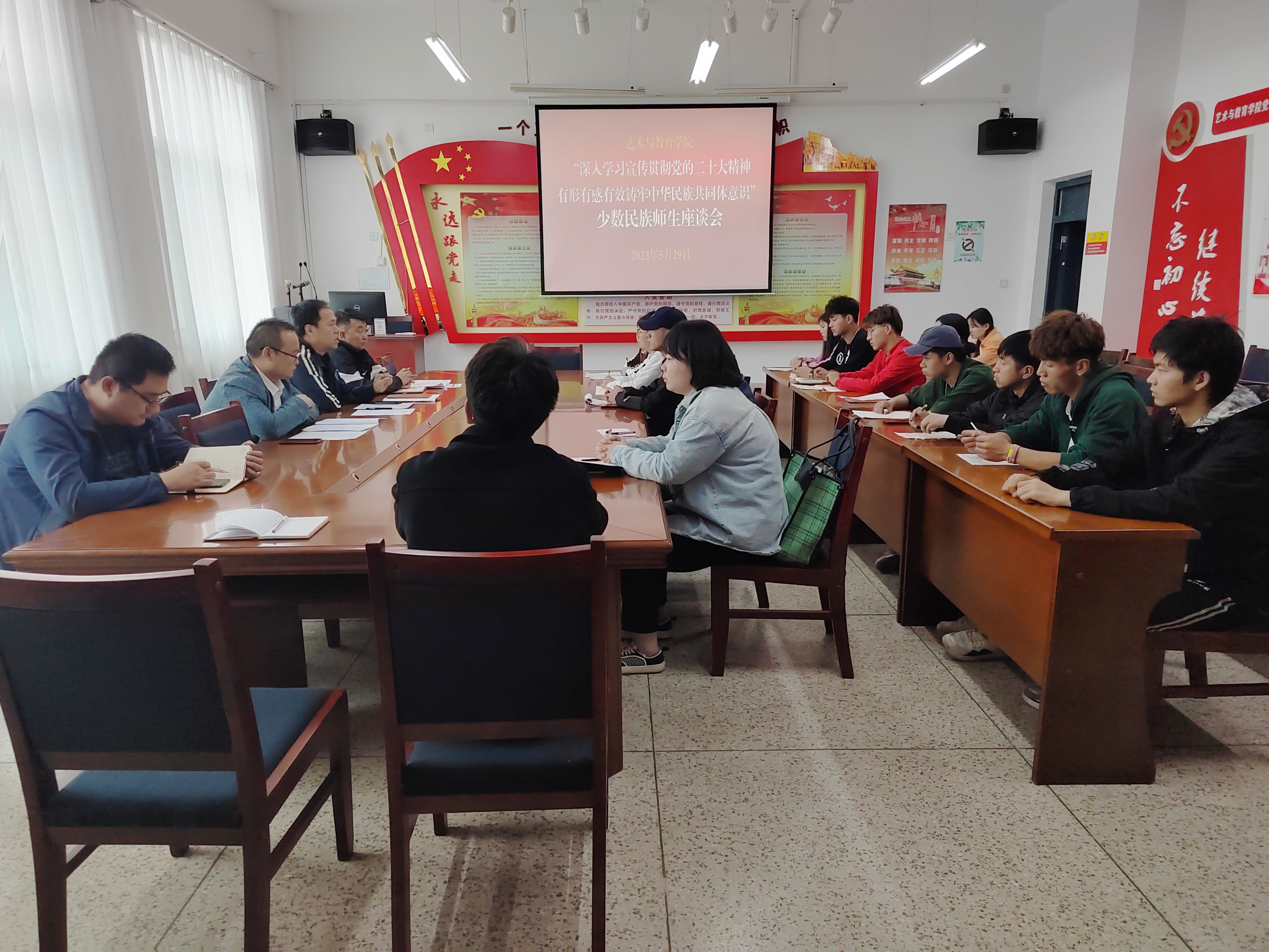 2023年5月29日下午,藝術(shù)與教育學(xué)院召開2023年第20個(gè)民族團(tuán)結(jié)進(jìn)步宣傳月各民族師生座談會(huì),2022級(jí)各專業(yè)各民族學(xué)生代表,各民族師生代表和輔導(dǎo)員、班主任參加會(huì)議,會(huì)議由藝術(shù)與教育學(xué)院黨總支書記王政主持。