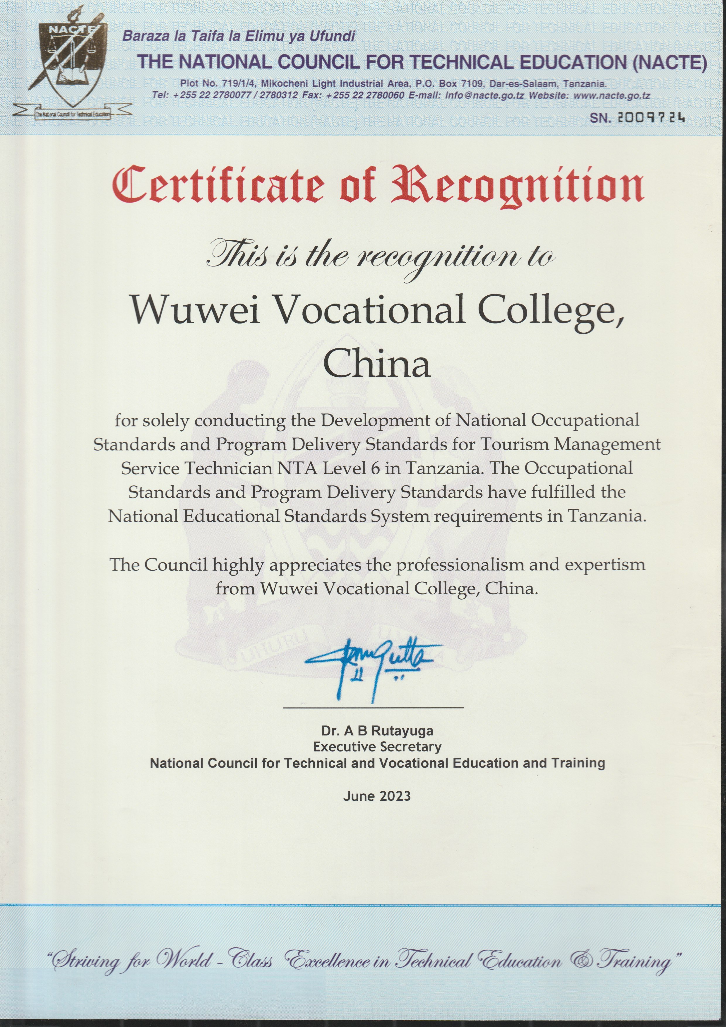 6月16日,學(xué)校獨立開發(fā)制定的旅游管理服務(wù)技術(shù)員6級職業(yè)標(biāo)準(zhǔn)和配套專業(yè)教學(xué)標(biāo)準(zhǔn)通過了坦桑尼亞國家職業(yè)教育委員會審核,獲得認(rèn)證,正式納入坦桑尼亞國家職業(yè)教育體系。旅游管理服務(wù)技術(shù)員6級職業(yè)標(biāo)準(zhǔn)和配套專業(yè)教學(xué)標(biāo)準(zhǔn)由學(xué)校經(jīng)濟管理學(xué)院旅游管理專業(yè)教師許春華、占發(fā)禹、張語悅、王美婕、閆亞旗、劉金萍六位教師共同開發(fā)制定。