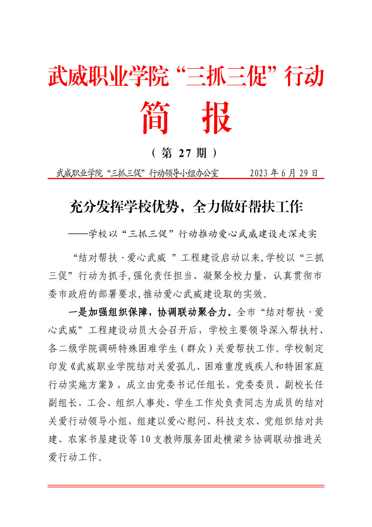 簡(jiǎn)報(bào)第27期:充分發(fā)揮學(xué)校優(yōu)勢(shì),全力做好幫扶工作——學(xué)校以“三抓三促”行動(dòng)推動(dòng)愛(ài)心武威建設(shè)走深走實(shí)
