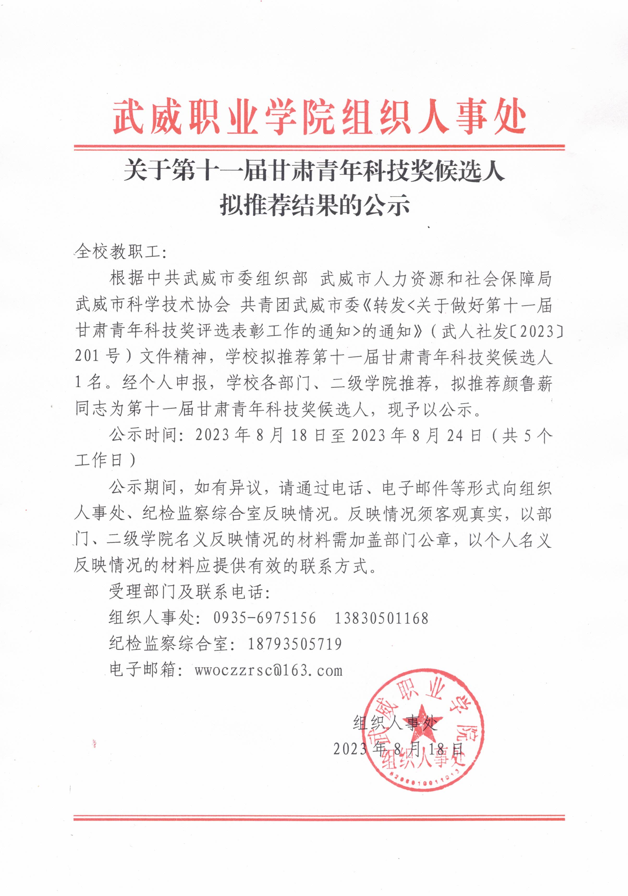 關于第十一屆甘肅青年科技獎候選人擬推薦結果的公示