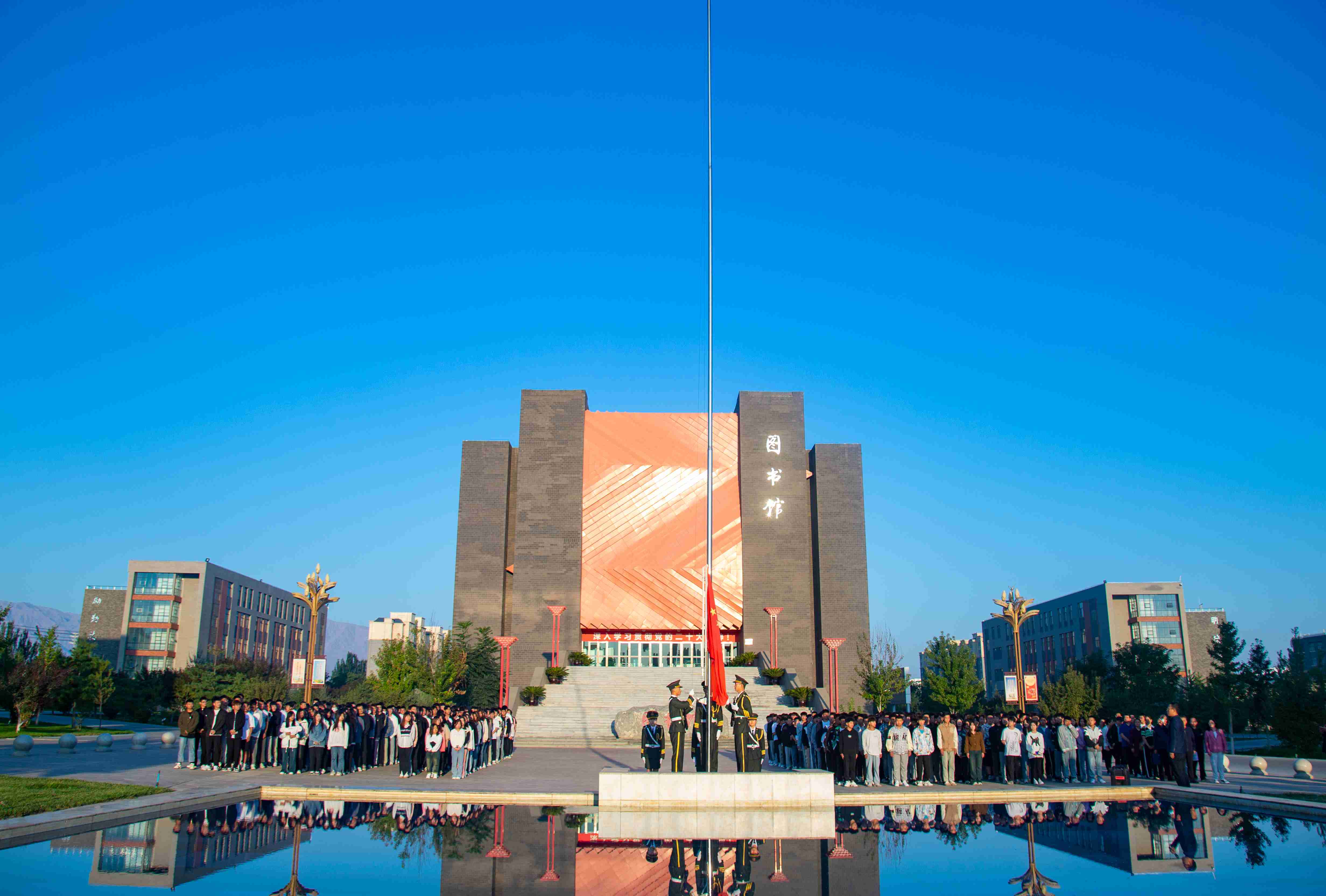 8月28日早上7點,信息技術(shù)學院在圖書館廣場舉行升國旗儀式,黨總支書記潘從明、院長李亞梅和全體師生參加了此次升旗儀式。